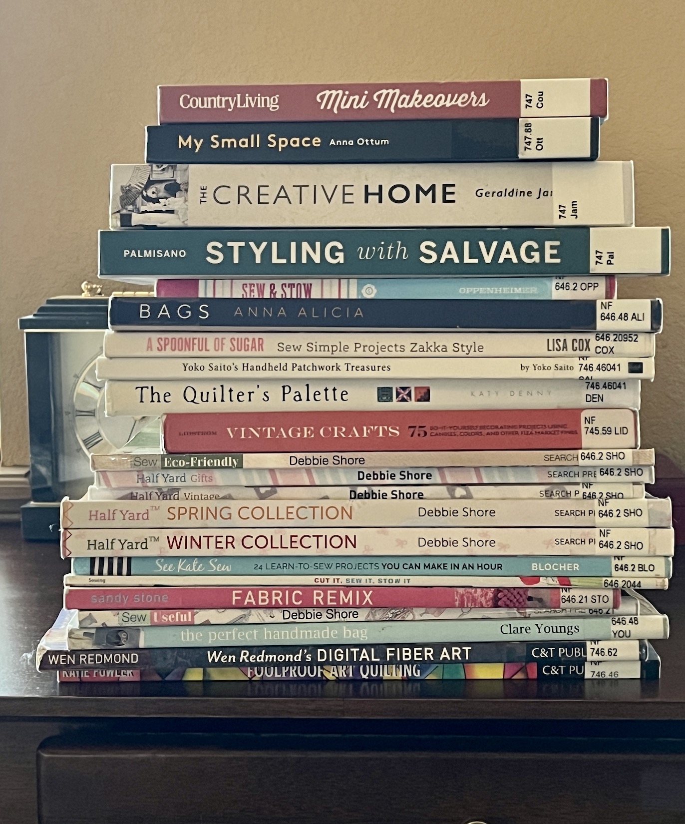 I just finished wrangling the quilt, with just the batting attached (to act as interfacing), under the sewing machine to machine applique down all those letters. So I am moving forward despite distraction from my latest (and unrestrained) “Library Stack”!
