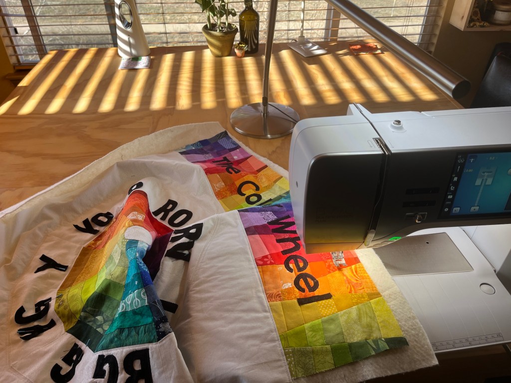 I added “The Colour Wheel” to the banner made by the trimming scraps; and labeled each of the colorways.