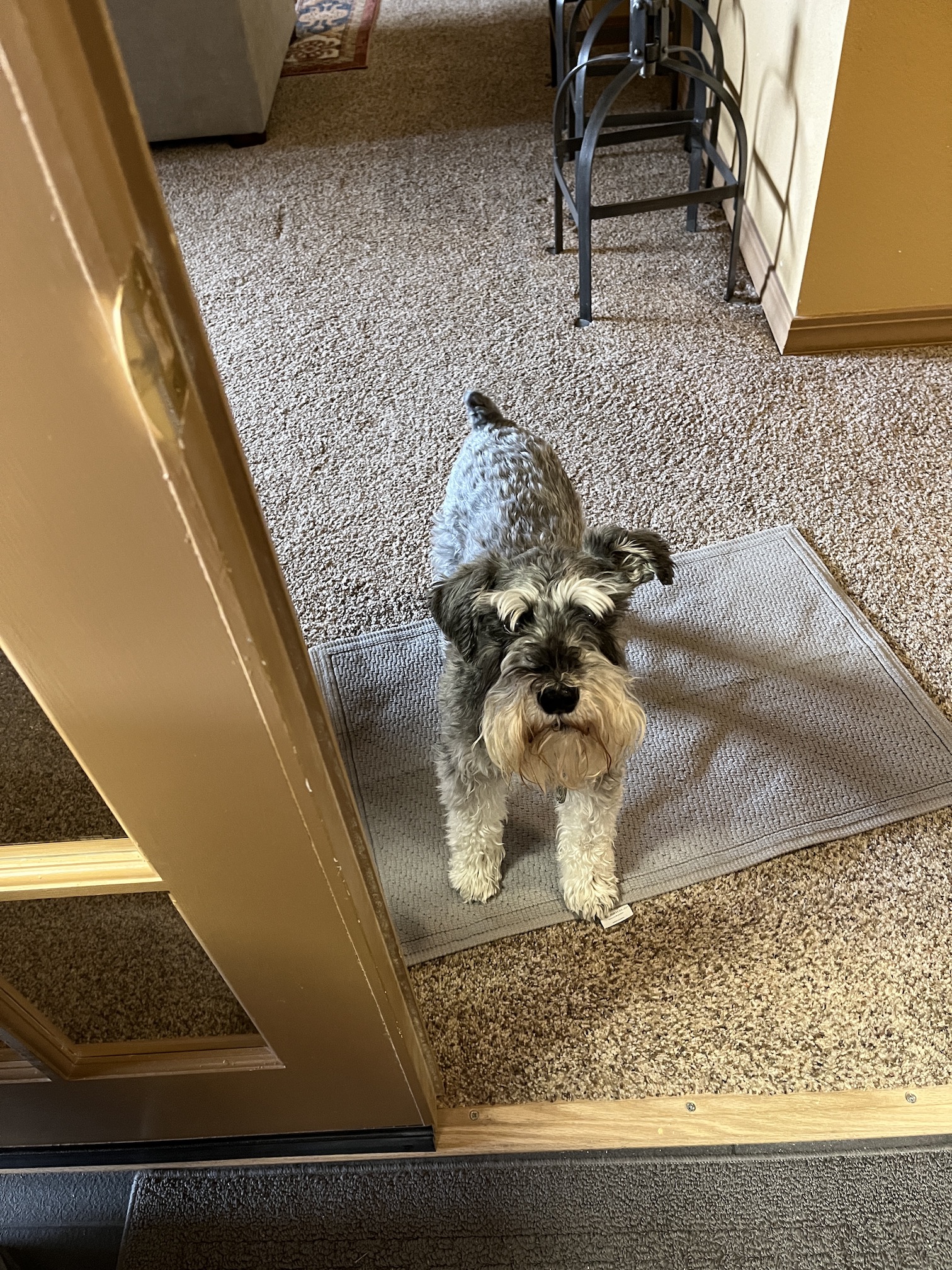 Oh and here is Mike the Miniature Schnauzer peeking into the woodshop (he is never allowed inside the shop as we are worried about wood splinters getting into his paws) to see what his humans are up to!