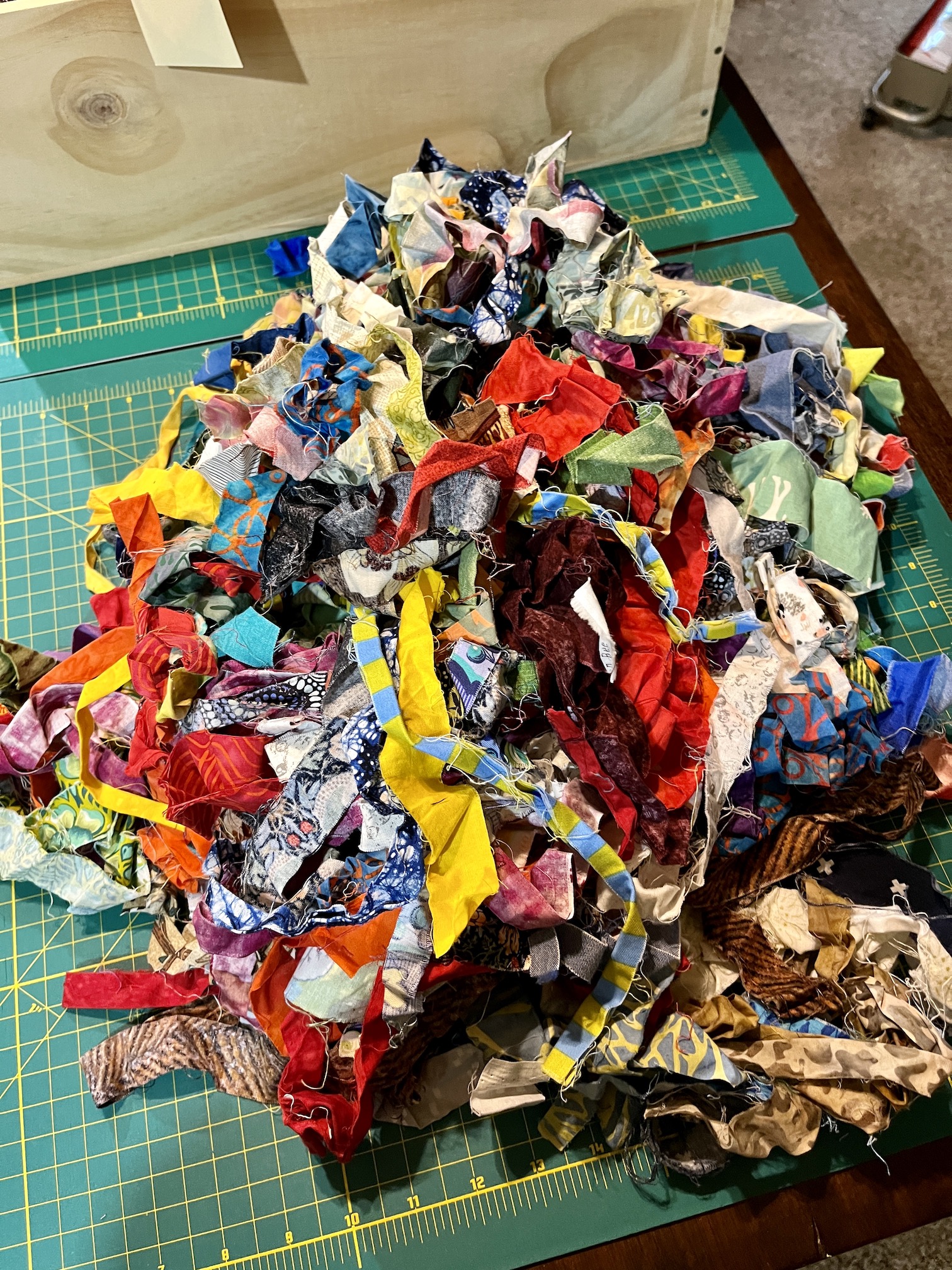 I got my scraps already sorted by color (or type as I keep Batik fabric scraps separate) and they are ready in their wine crates: