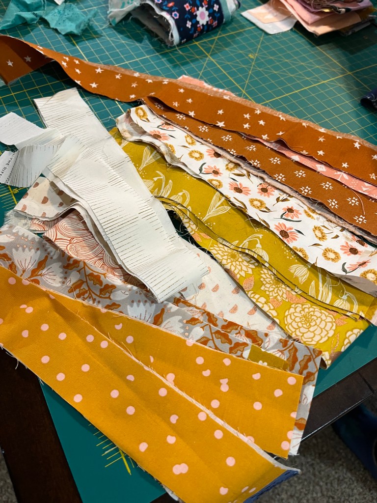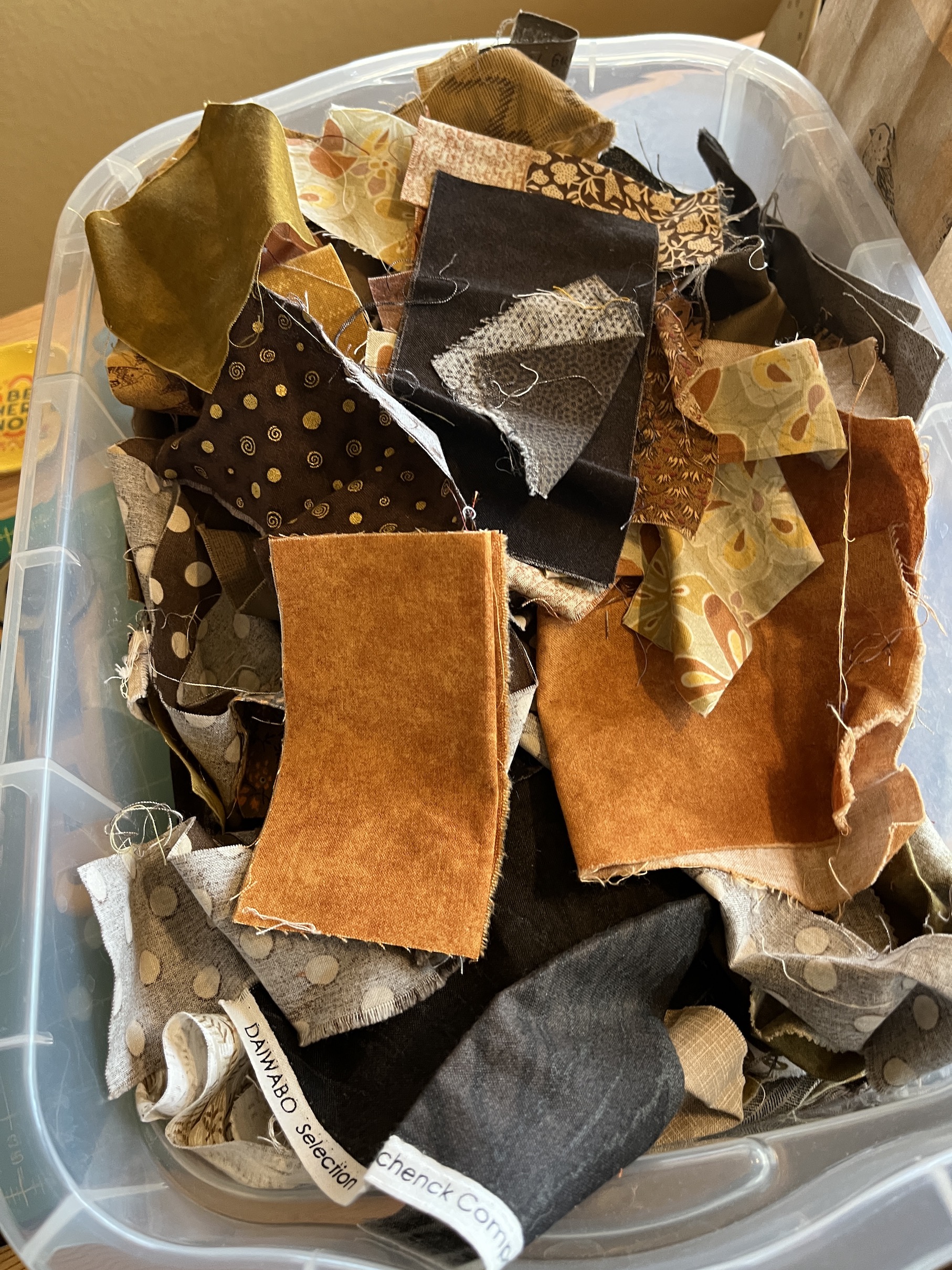 During the retreat I “shopped” from my collection of brown, cream, yellow and gold scraps and selected this collection of scraps to which I also added a couple orange-brown scraps and some scraps D brought to the retreat: