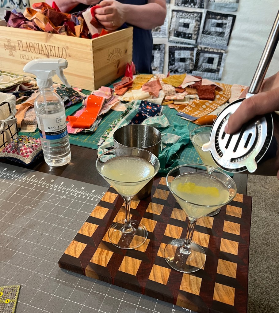 Only one cocktail per person so we did not end up sewing our fingers into the blocks or something disastrous like that!