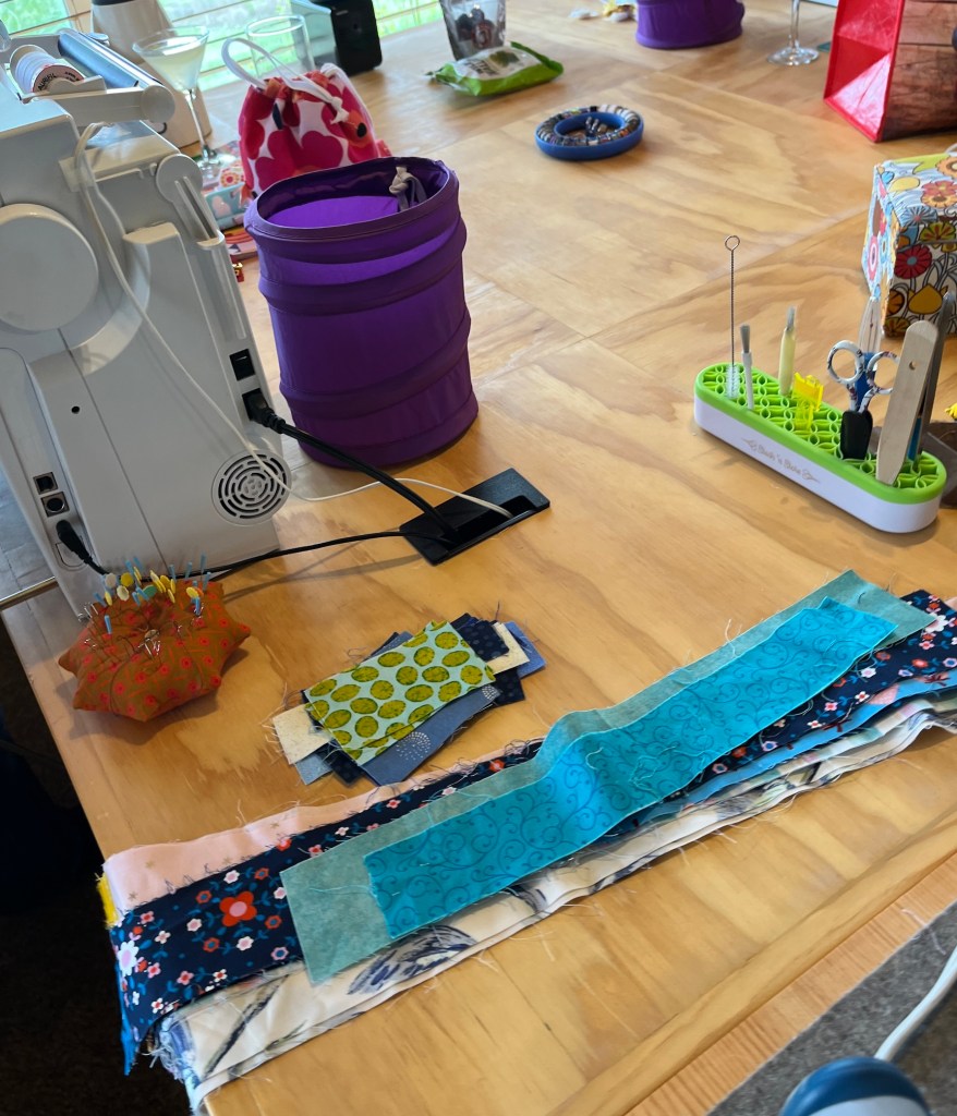 My sew table is set up for the retreat, I pulled out my other Bernina sewing machines – my QE 440 with 7 million stitches (see post7 Million Stitches+) and my little 215 that I take to classes.