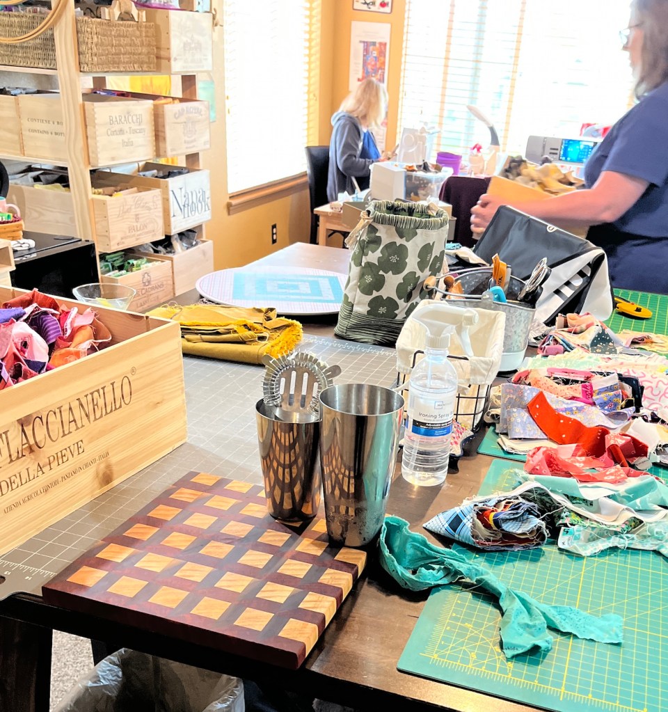 At one point John came by the studio to visit and to bring us our late afternoon cocktails (lemon drops) as our reward for all that hard work selecting scraps and beginning to work on our blocks!