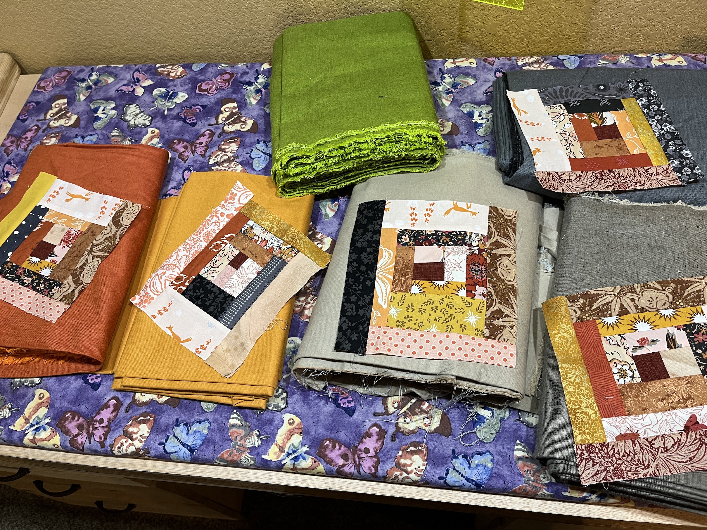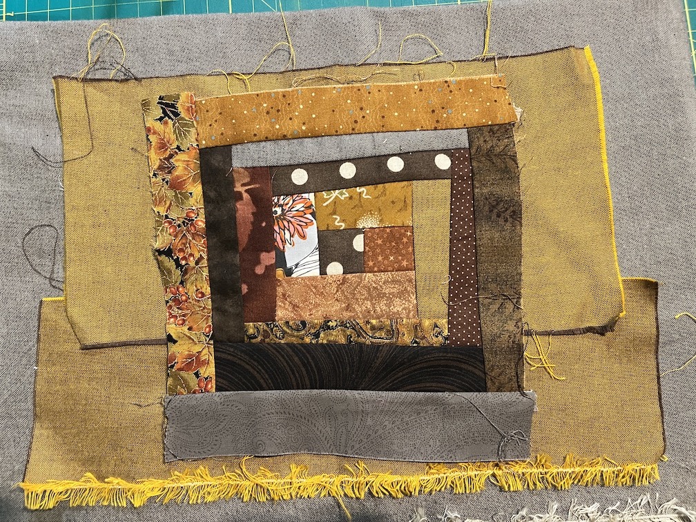 We continued working on our improvisational log cabin quilt blocks or “log jamming” which I was originally introduced to during a class I took at the Stitchin’ Post in Sisters, Oregon (I also remember that I’ve previously referred to this type of piecing as making “free form” log cabin blocks).