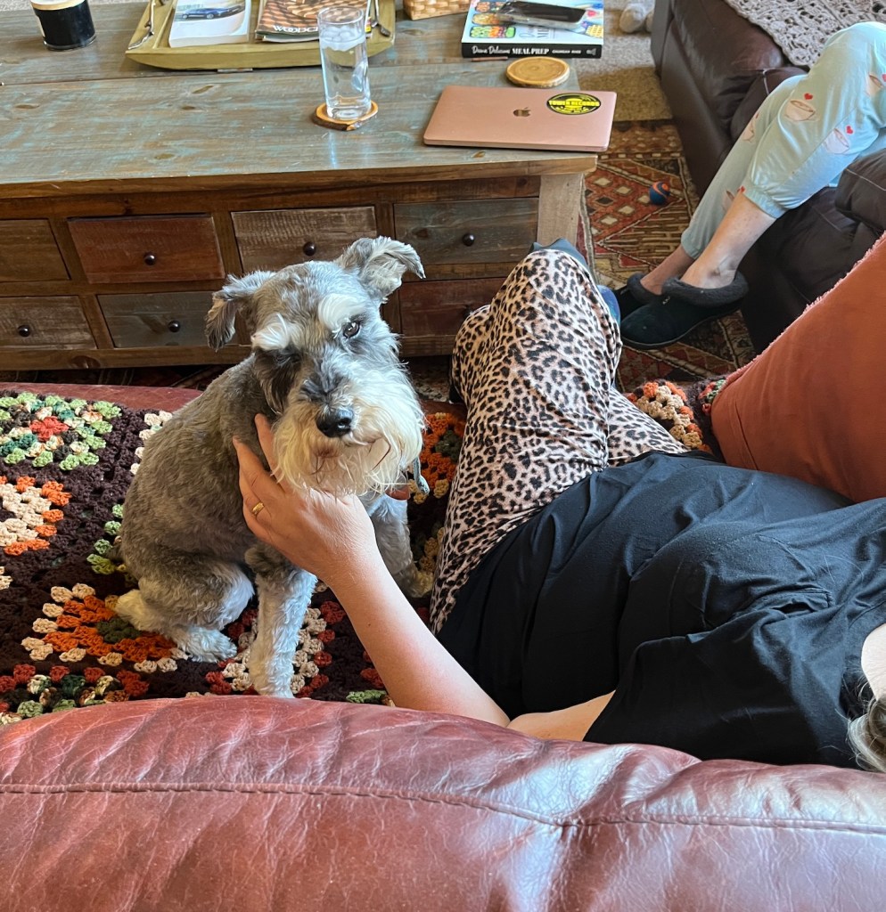 And to close this post here is Mike the Miniature Schnauzer sitting between us as we all sat on the sofa (we served the food buffet style) watching the NBA Basketball Playoffs, trying to convince us to share our feast (we did not as there were no Schnauzer friendly foods on our plates, but he did get lots of pets from our friends while they ate…):