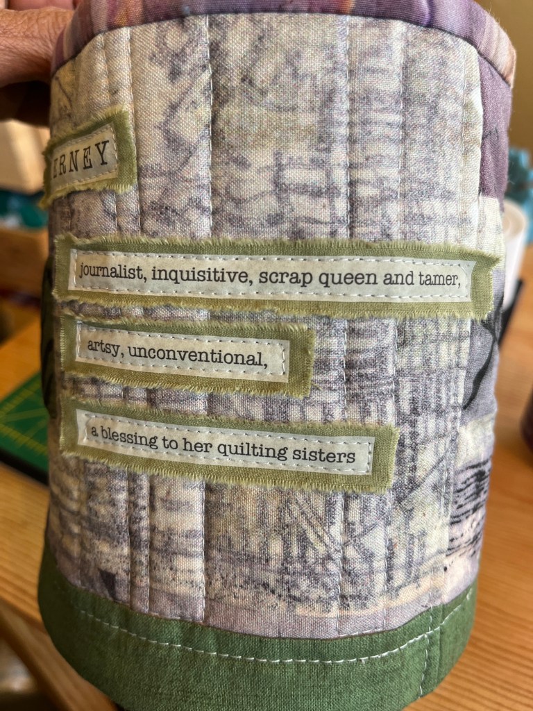 I enjoyed putting my trimming scraps in the amazing handmade custom scrap basket that D made me (her own design, no pattern used!) with Marcia Derse fabric (my favorite):