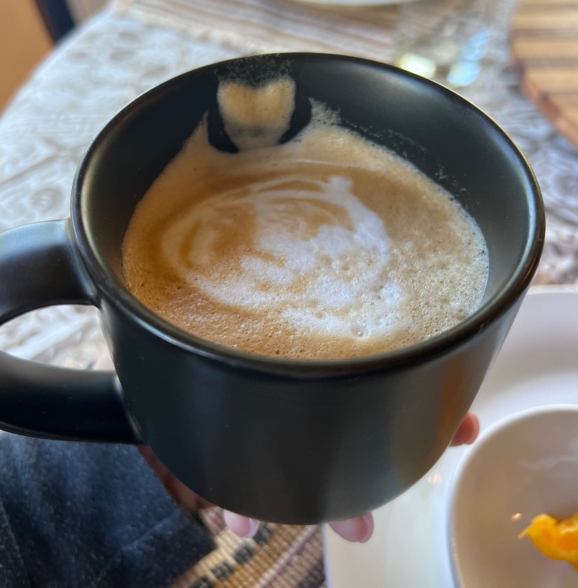 John has been playing with our new espresso machine we got earlier this year to celebrate our one year anniversary (see post New Coffee (and Tea) Station and Some Big News), and he continues to try to channel his “inner barista” and do designs in the foam. He made a latte for one of the retreaters K – we aren’t sure what the design can be interpreted to be – but K noticed there was a heart (unintentional) along the upper edge of the cup!