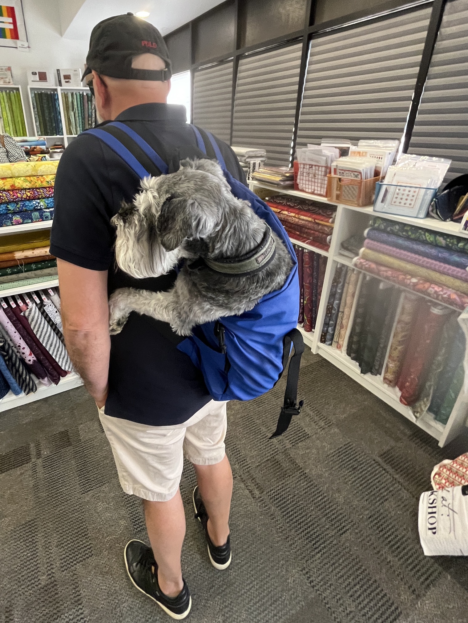 By the time we got to Treelotta it was time to let Mike the Miniature Schnauzer out of the car for a pee (we spent a ridiculous amount of time in Holly’s Quilt Cabin) and to put him in the backpack so he could get a break from sitting in the car. John took Mike in the backpack to a nearby army surplus supply shop for a wander, and then back to the quilt shop to see what kind of trouble we were getting into with all the lovely fabric choices!