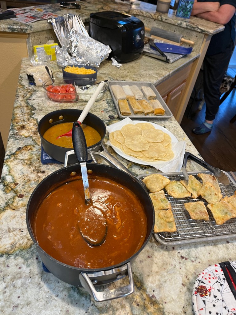 My husband John is of Mexican decent (he is 1/2 Mexican, 1/2 Irish) and learned to cook green and red chili as well as other dishes from his Mexican grandmother. Our friends F and M are of Mexican decent and have much experience making authentic dishes they learned from relatives. We decided while meeting for drinks last week that it would be fun to get together and have a homemade Mexican food feast to include: