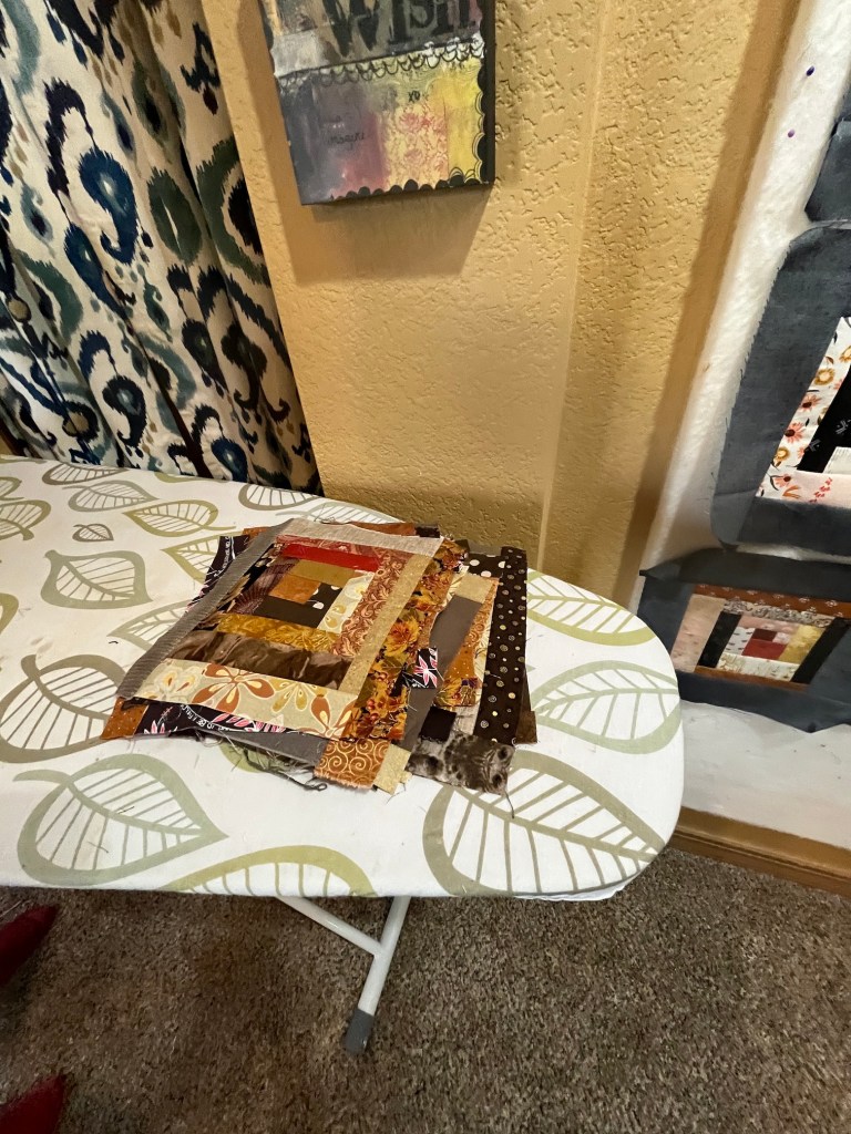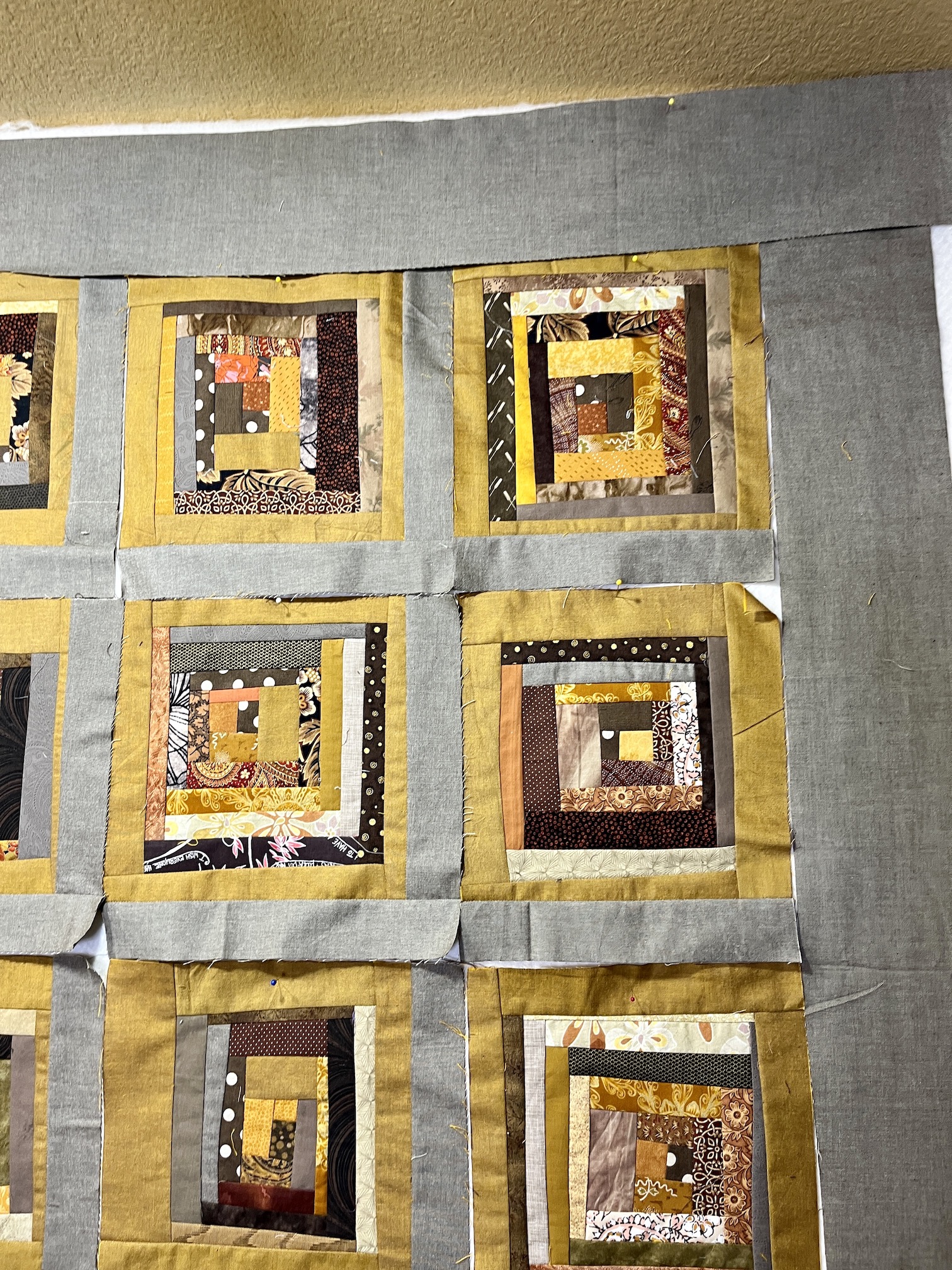 Yesterday I made some major progress on the freeform scrap fabric log cabin quilt I am making in browns and golds.