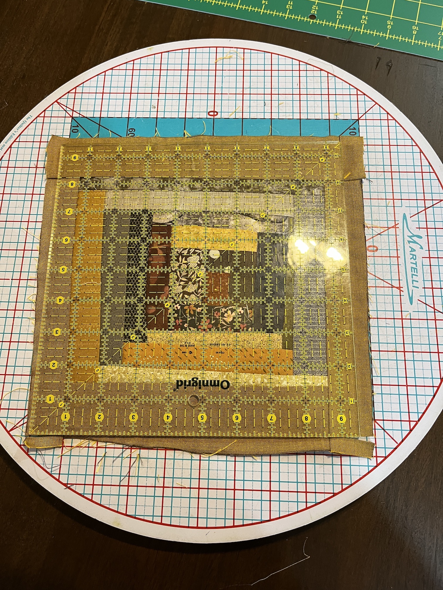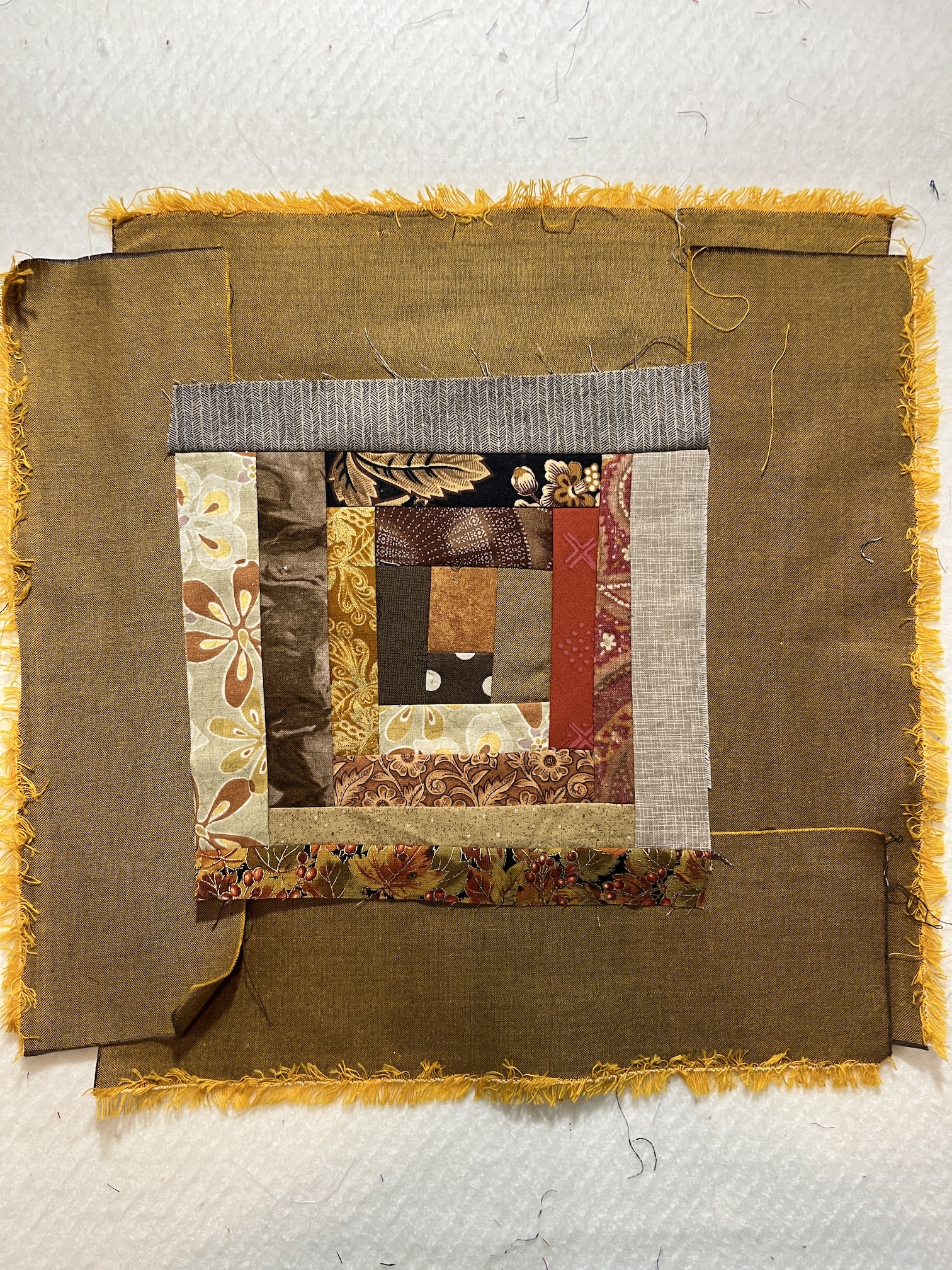 I’d originally trimmed the freeform log cabin block trimmed in gold Peppered Cotton and trimmed the block to 9.5 x 9.5 inches with my 9.5 x 9.5 inch square ruler. Then I tried framing it in the taupe and trimming it to 12.5 x 12.5 inches using my ruler of that size (the next size up ruler I own after 9.5 x 9.5 inch).