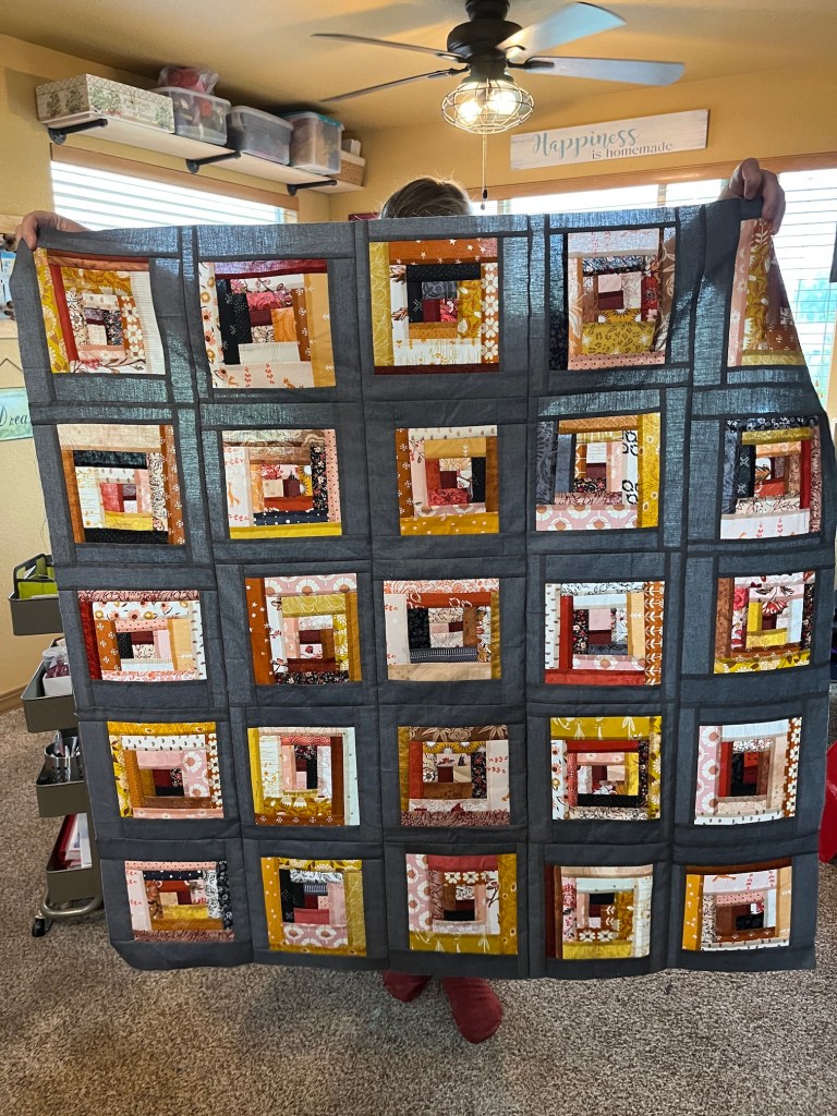 D was a bit of an overachiever, ha, and actually finished her quilt top (but I think she is also going to add a 3.5 inch border of the gray around it to make the blocks “float” even more and she took some extra fabric home with her) and plans to hand quilt it.