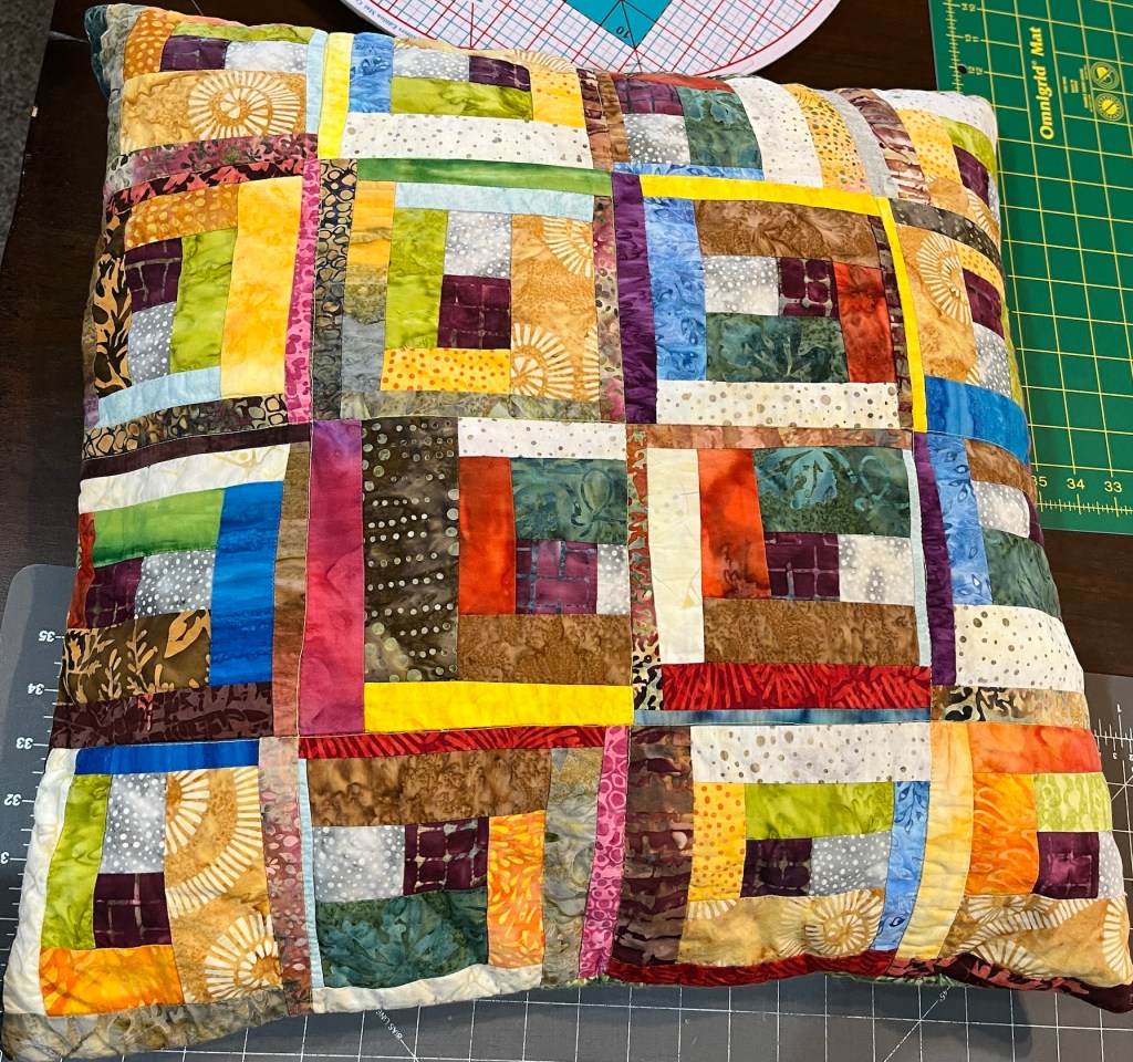Or you can skip the “framing” of the blocks in a solid color and just sew the blocks directly together like I did for these two pillows I made out of batik scraps: