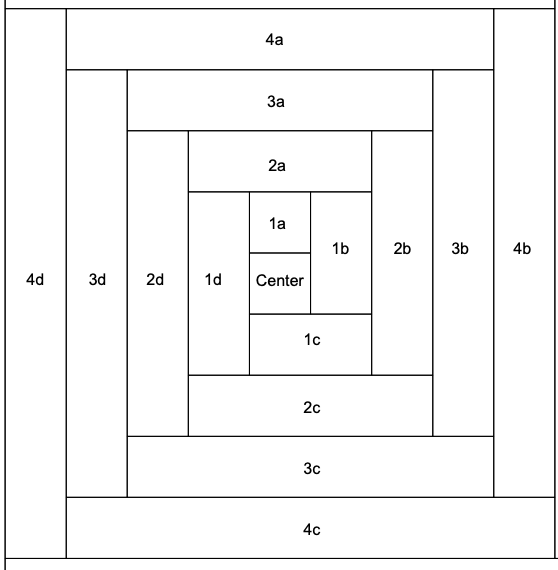 First you need to understand the concept of Log Cabin Block piecing where you start with a center square and build around it. Below is a screen shot from Generations Quilt Patterns on How to Make a Log Cabin Blockthat illustrates the Log Cabin Block piecing concept:
