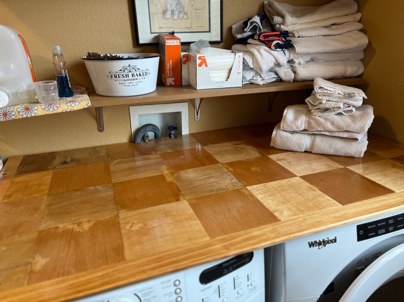 Our mudroom (please see link if you are outside the U.S. and unfamiliar with this term), was fairly generic – a place to do our laundry, use the utility sink, store some shoes, and to hang clothes as they dried. It had generic white metal racks from a home improvement store.