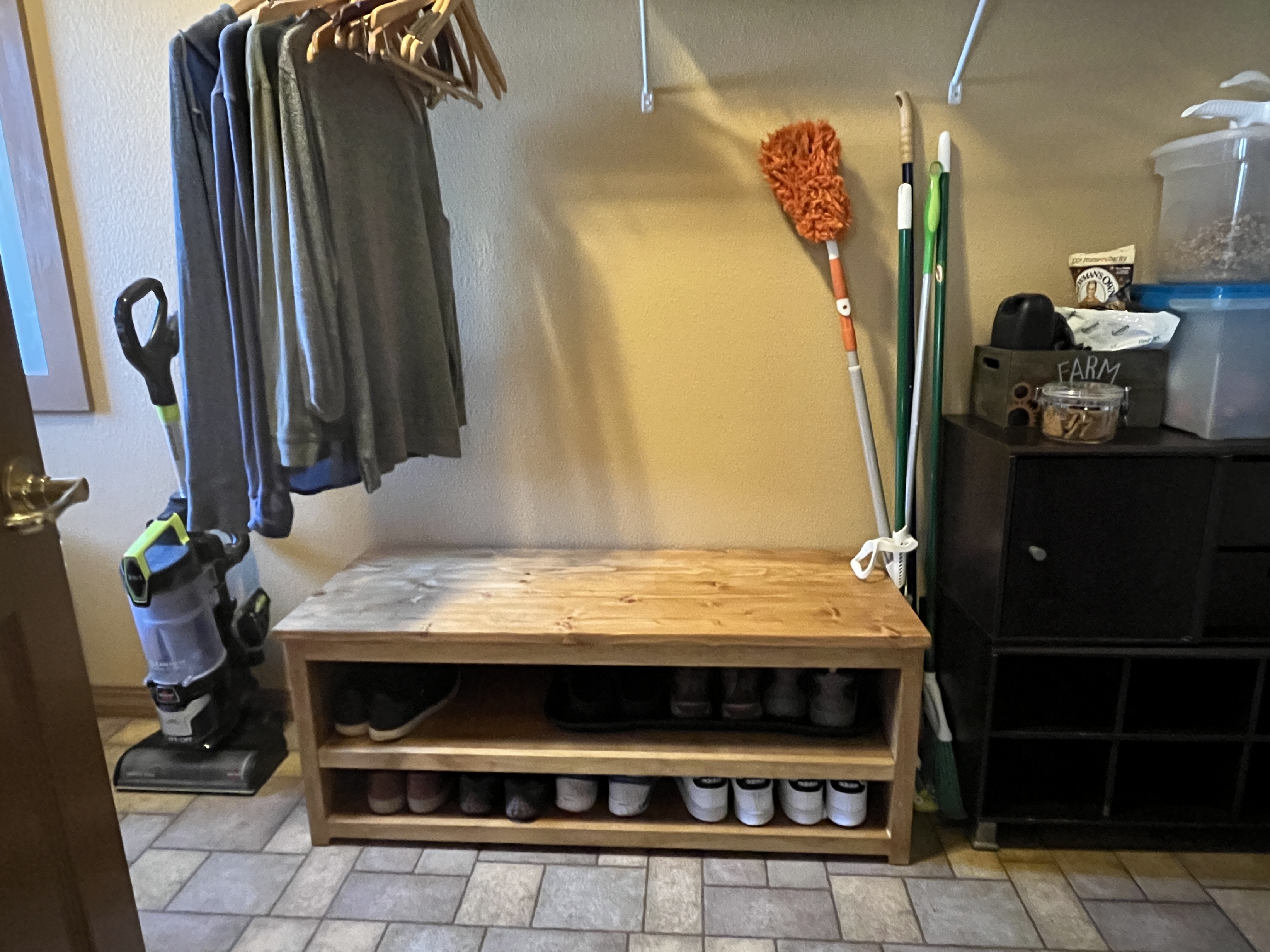 John decided to make our mudroom a lot more interesting by building storage and adding convenience items.