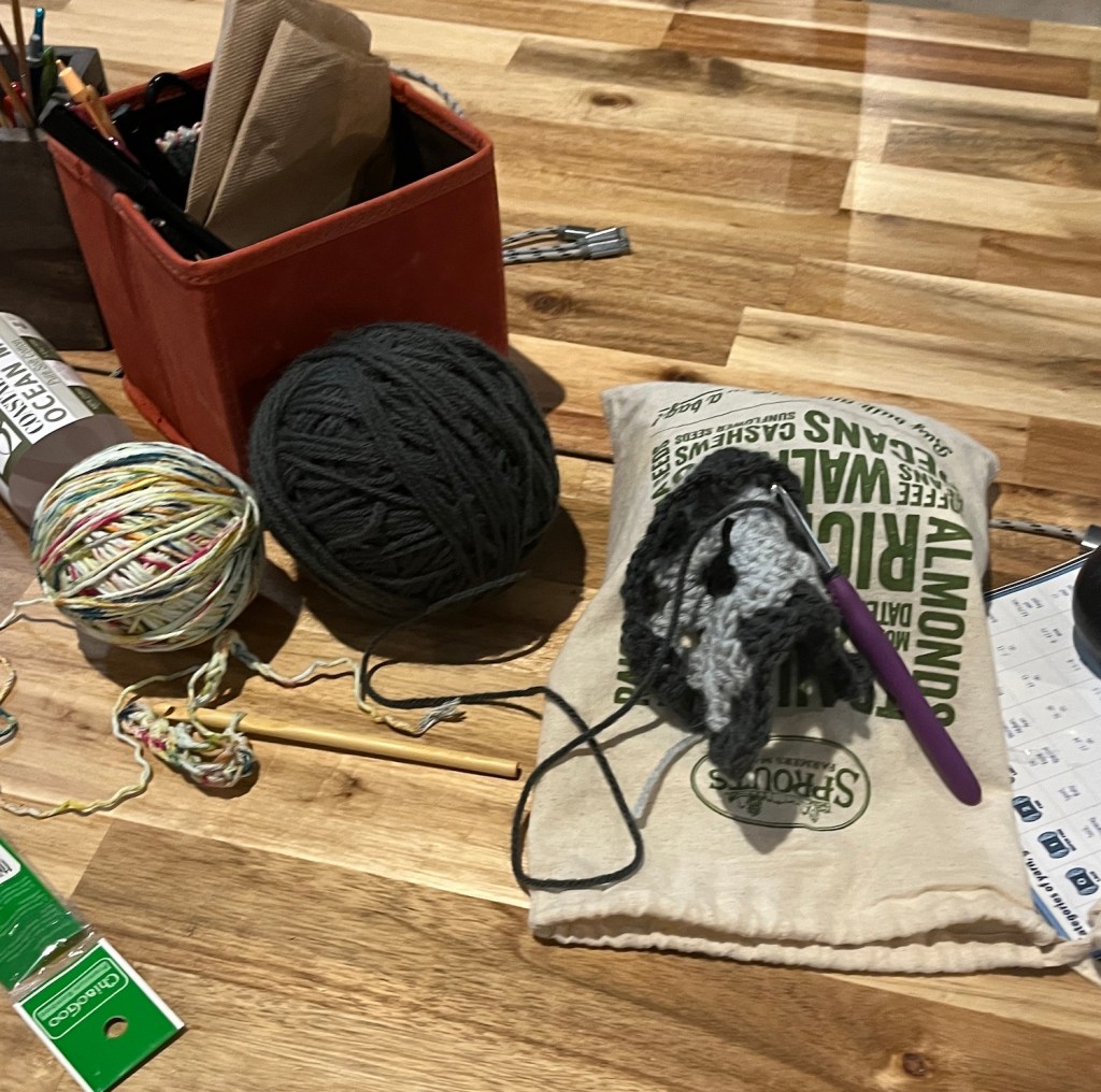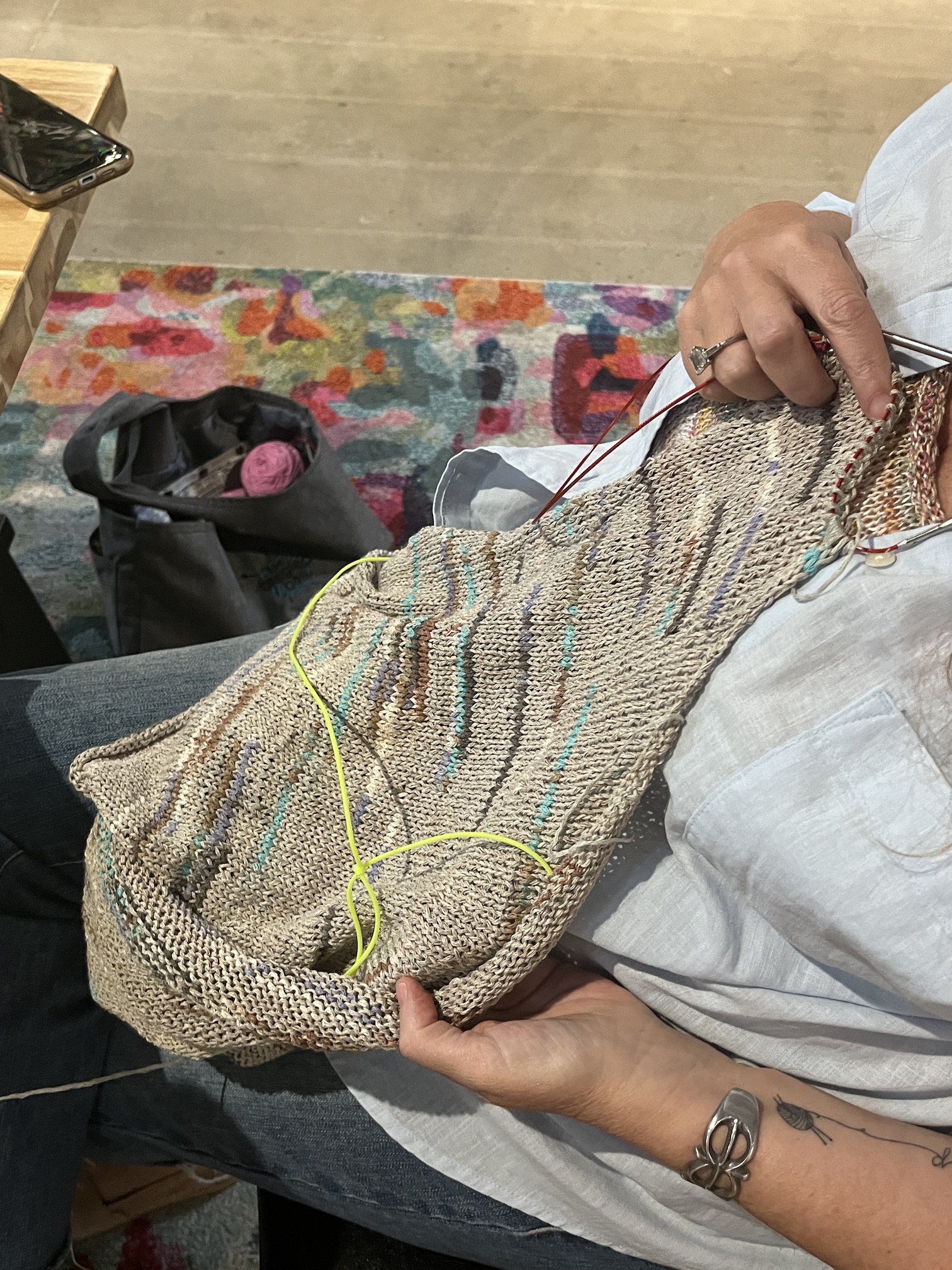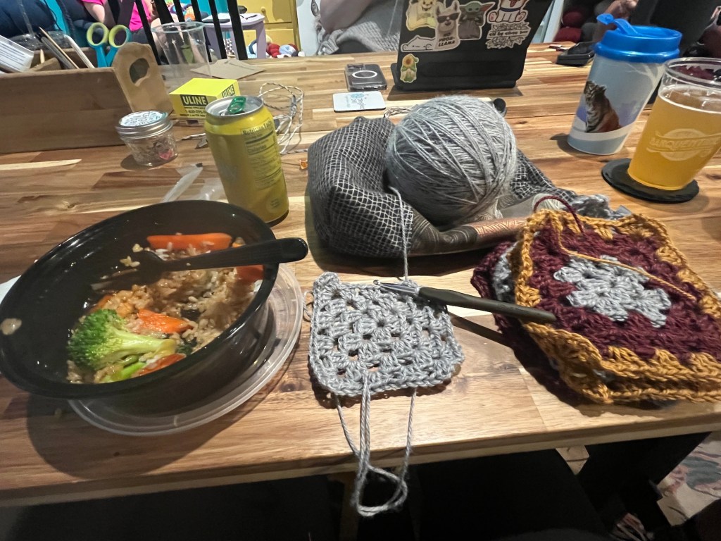 At the Colorado Makers Night Out I worked on my granny squares, while dining at the community table and visiting with some VERY talented and engaging knitters. Below are photos of my section of the table (my food, my project, and a drawstring bag I brought it in); and and amazing sweater (the photo does not do it justice) that one of the knitters was working on: