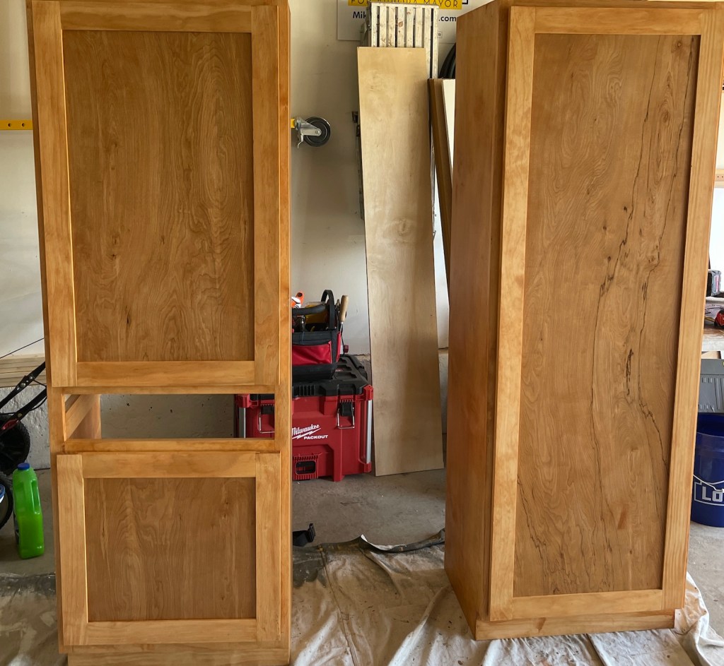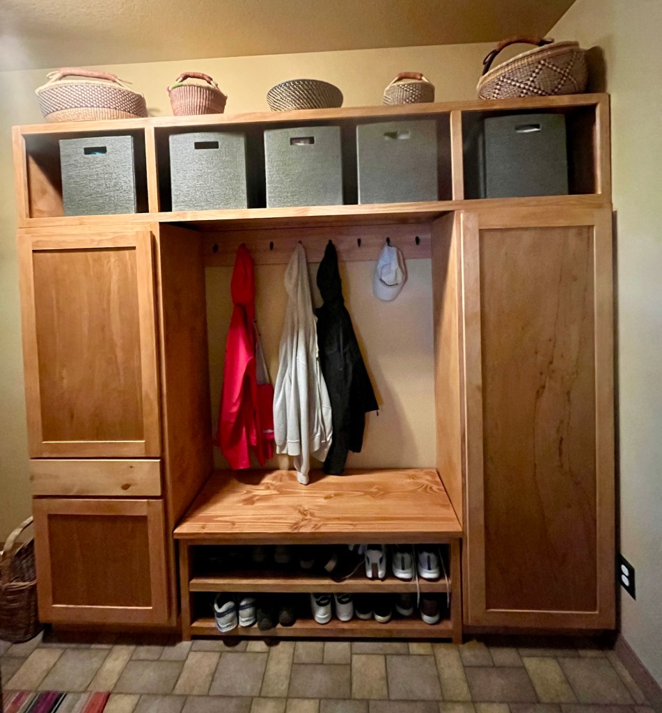 After the bench was complete, he worked over the past 6 months (sporadically), to complete the rest of the mudroom storage build out. Here are some photos of John’s work in progress: