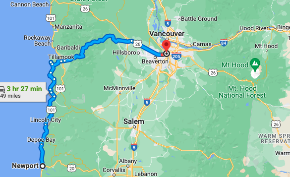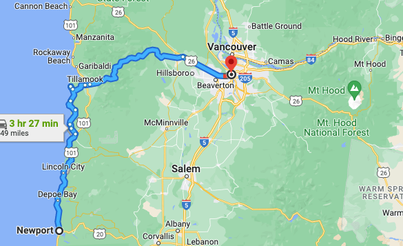 Here was our route from Newport, Oregon (on the coast) to Portland, Oregon (inland). We took a different route back to Portland than the one we took to the Oregon Coast (where we went through McMinnville) in the post Oregon Coast Adventures: First Stop -McMinnville, Oregon: