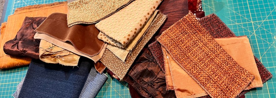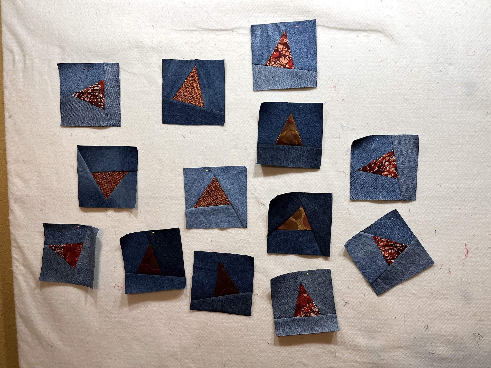 I wanted to make a piece that is primarily recycled denim but also includes home decor fabrics in warm colors with lots of textures. I decided to revisit a piece I made in my early days of improvisational/art quilting (circa 2012/2013) where I was working with recycled silk and linen couture fabric samples – Flying Triangles: