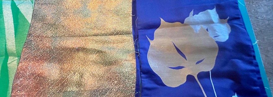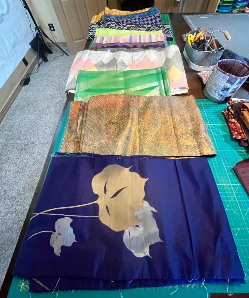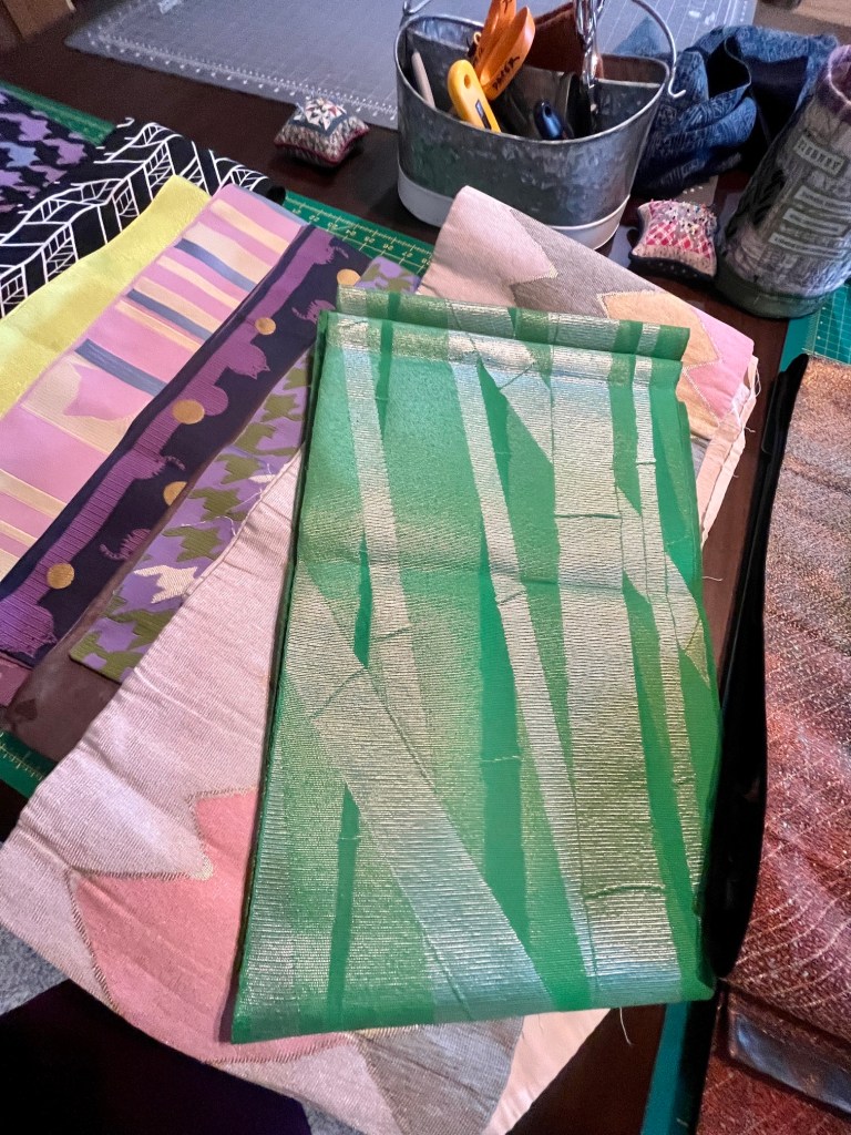 My sister has a friend who imports kimonos from Japan and she had had a collection of kimono obi sashes that were no longer needed. She thought I would be able to recycle the fabric into something else.