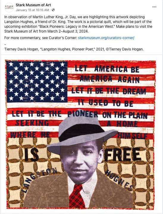 I discovered late today that the Stark Museum of Art posted about my quilt Langston Hughes: Pioneer Poet on their Facebook page: