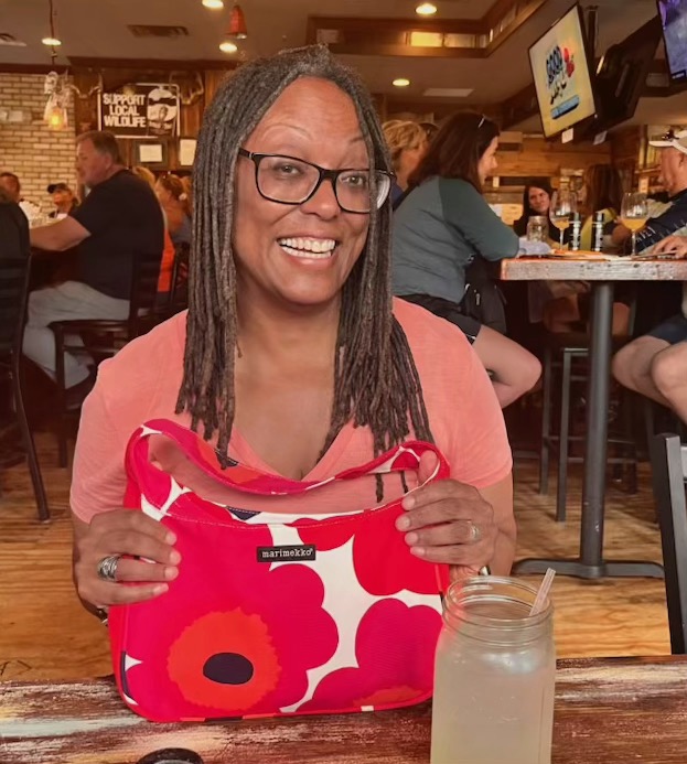 Here I am with a fantastic Marimekko purse I found for $5 at one of the thrift shops:
