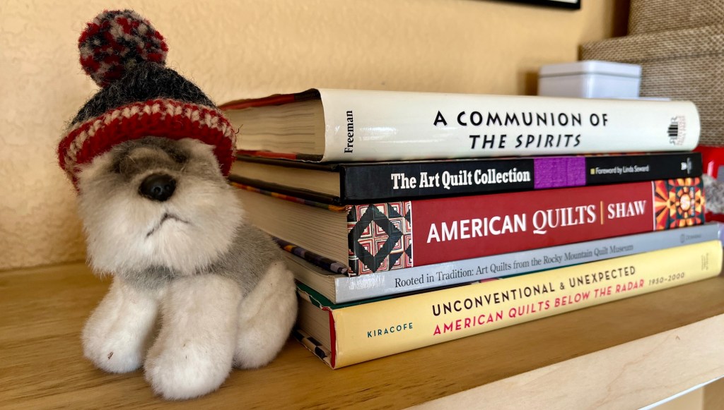 So now they sit on the bookshelf above my desk area and the schnauzer’s ears won’t get cold if a sudden wintry wind pops into the guest room!