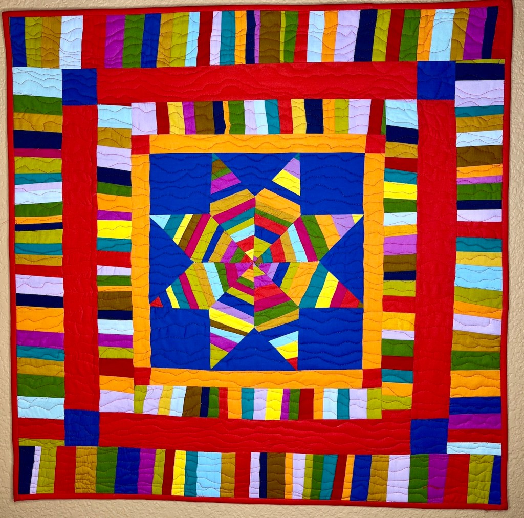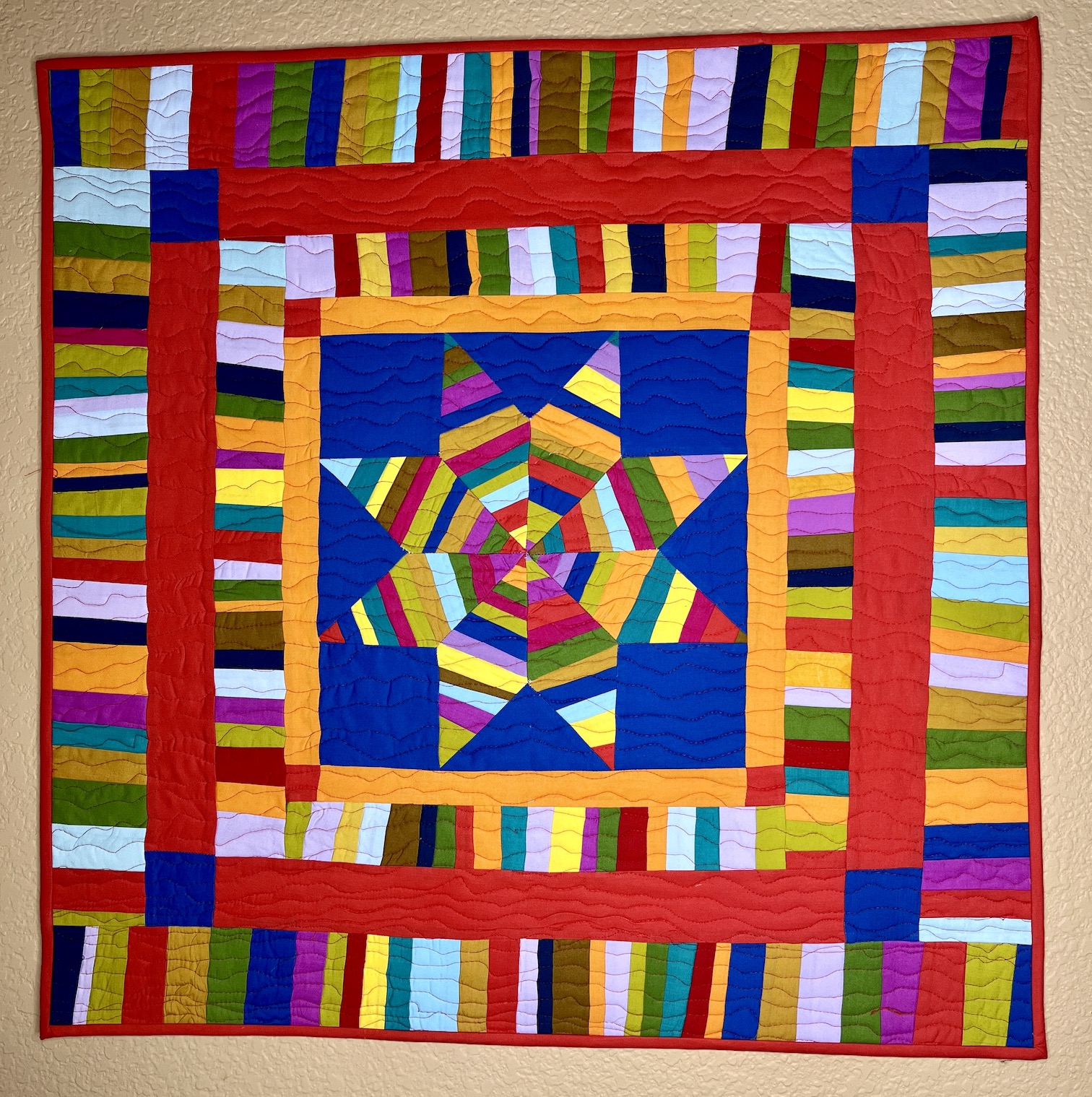 The pattern for Strings Attached is from August 2021 issue of AmericanQuilter Magazine, pattern by Lori DeJarnatt. I tried to mimic the color selections of the sample in the magazine as much as I could as I really liked it! (My quilting is denser than the sample in the magazine as I made a mistake on my first row of machine quilting when my hand slipped…so I made just repeated my mistake to make it consistent, ha!)