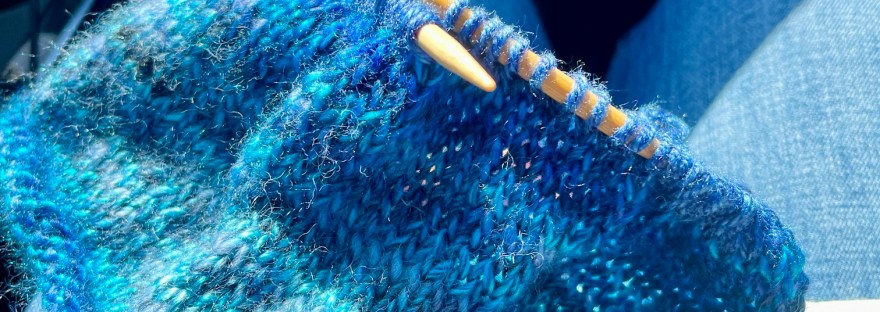 It’s actually going to be a two yarn hat as I am using up two different smaller leftover balls of yarn. I had enough of the variegated yarn you see in the photo above to get that far and now I am adding in a denim-ish colored yarn that is close to one of the colors in the variegated yarn.
