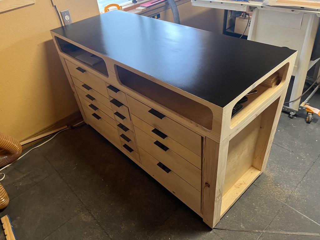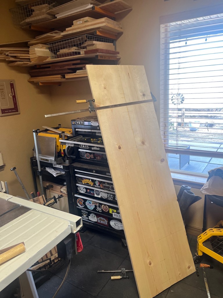 And they’ve started their first big project together: a new entertainment console for the basement movie area. So far they’ve made the top of the piece.