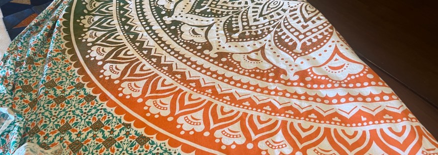 So I found a new backing for the quilt, this time a thrifted recycled cotton table cloth – very easy to sew through.