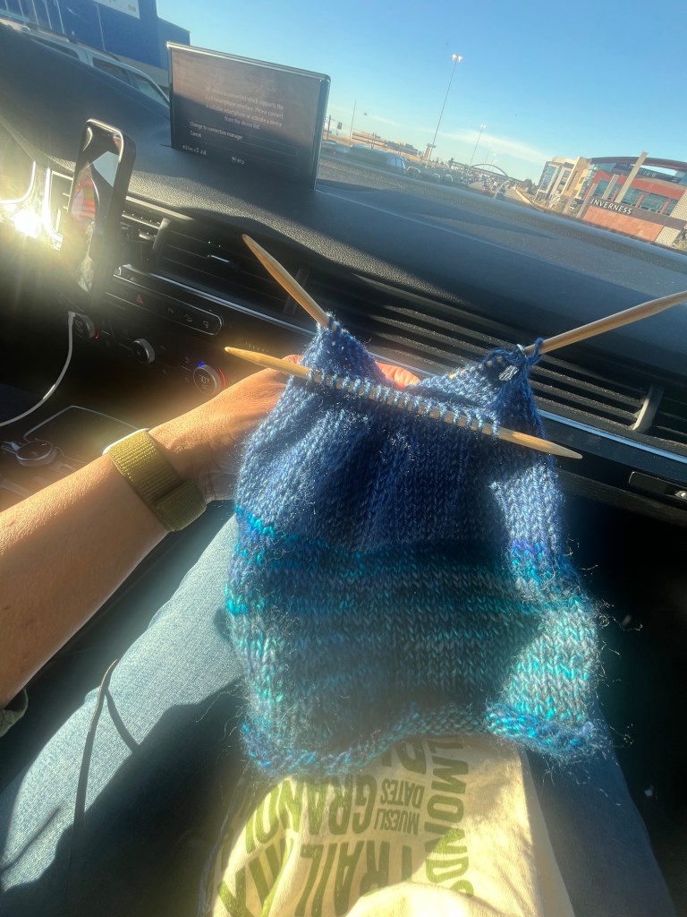 Here is when I got it to the double pointed needle stage (my favorite as it means it is nearly done!) while riding in the car: