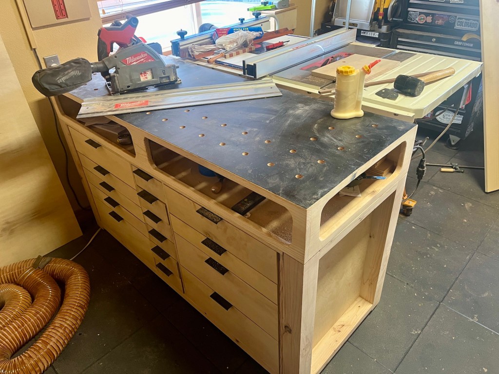 Recently he finished an Outfeed Table to butt up against his Table Saw. According to Fine Woodworking: “A good outfeed table is essential for safe woodworking, because it allows you to control the workpiece as it moves past the blade and off the back of the table saw. Without it, you’ll have to push down hard on the back of long boards, which makes it difficult to guide them safely past the blade.”