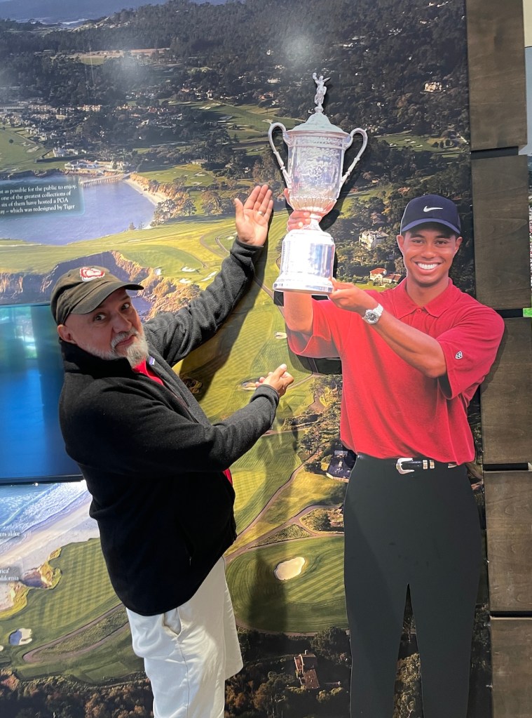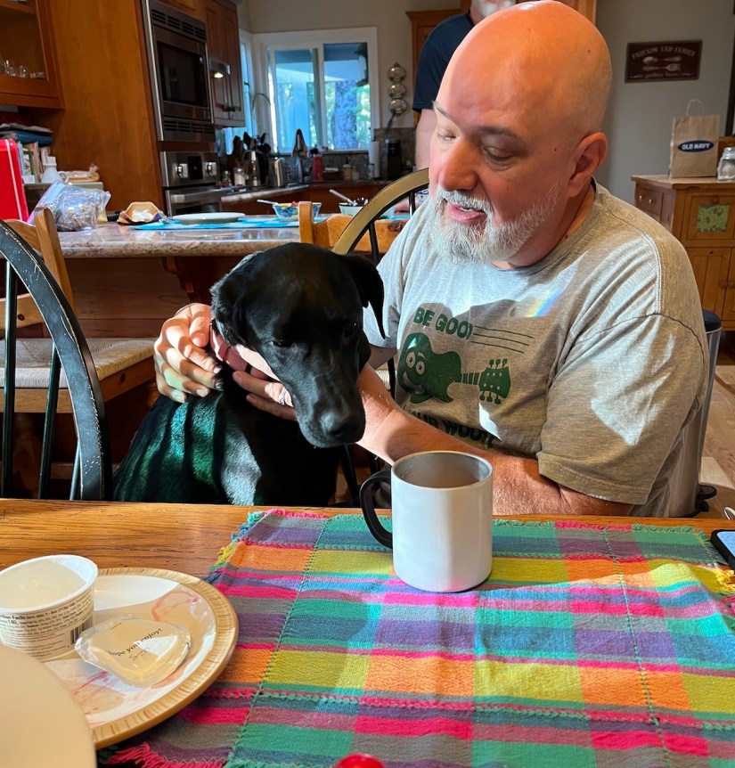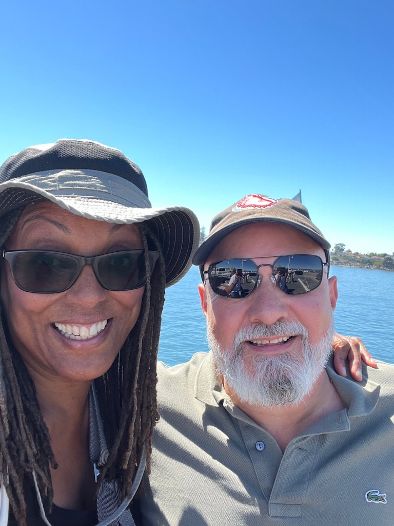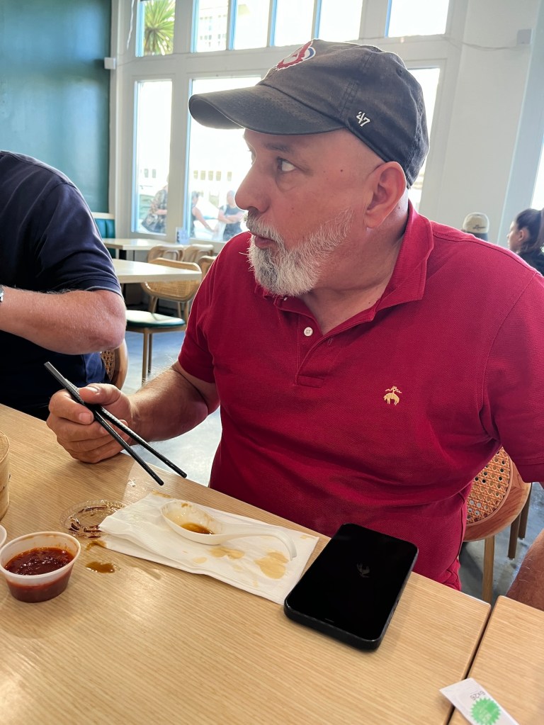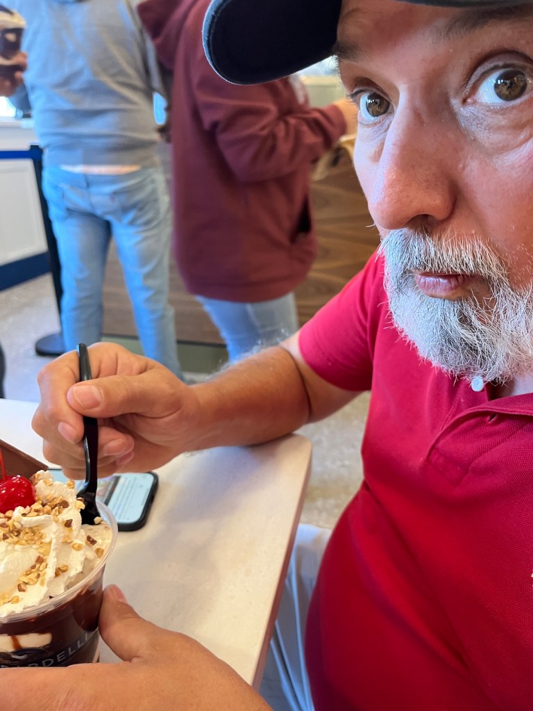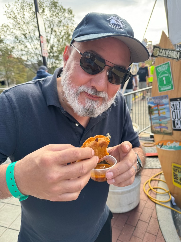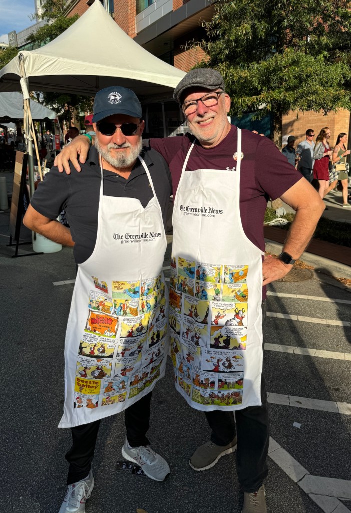 We had samplings of so many tasty dishes as the festival which was also like a “Bite of Greenville” festival with 50+ local restaurants showcasing their best dishes. Below is John enjoying some exceptionally tasty taco samples; and John and E posing with their new free aprons they got from the local newspaper’s booth (they both love to cook).