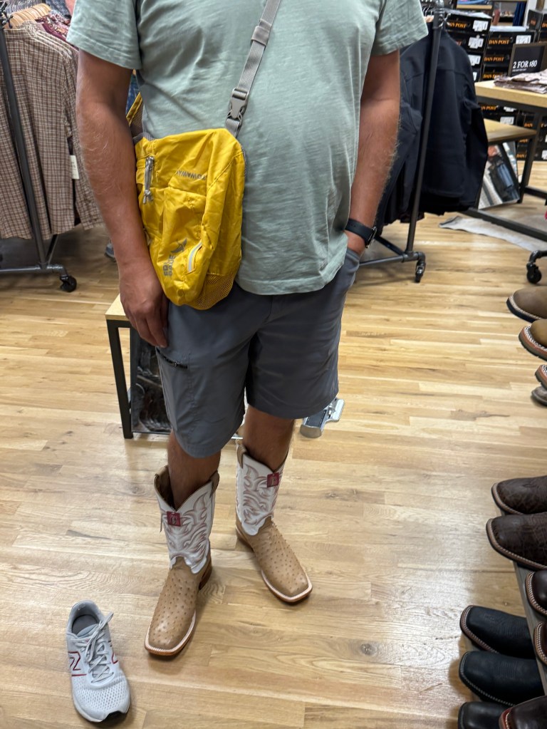 John was a sport and tried on some boots which went so nicely with his shorts (not! ha!):