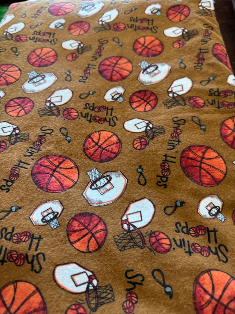 Oh and here is a photo of the basketball themed flannel (John loves basketball and was even playing in an intramural league where he was the oldest guy and the referee nicknamed him “Old School” – ha!) that will be on the back: