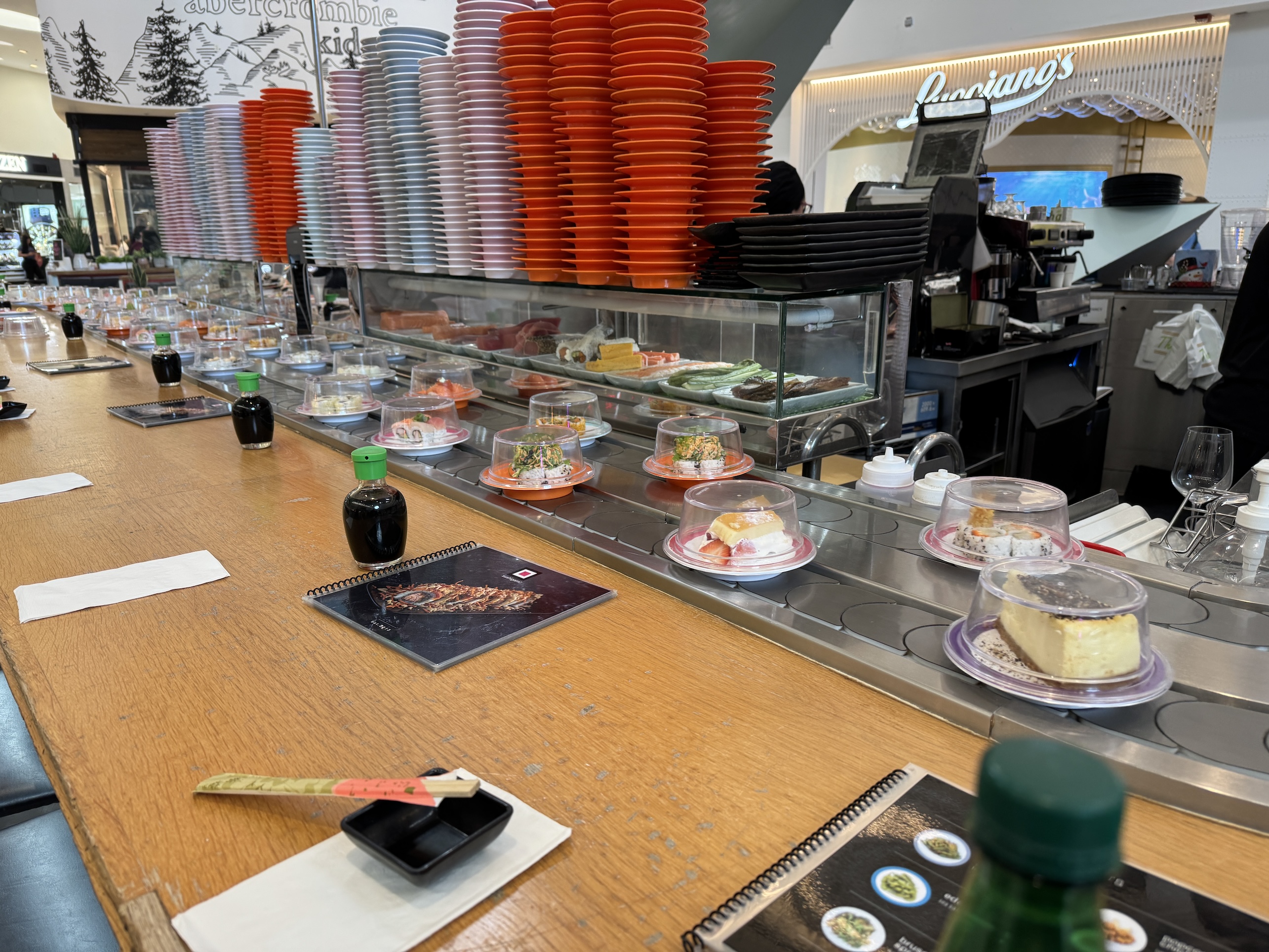 We had “conveyor belt sushi” at SushiGami in the middle of the mall and it was delicious (and fun to select your sushi as it moved by on the conveyor belt.