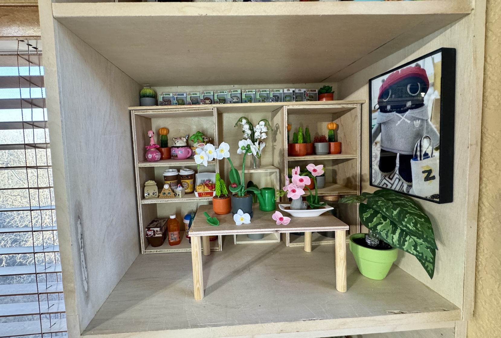 Well John Beastie and I don’t have a large collection of books like Human Tierney. We have a couple books that we are storing on the shelves in the but that’s it. So for now we are storing Tierney’s collection of miniature plants and some Knick Knacks.