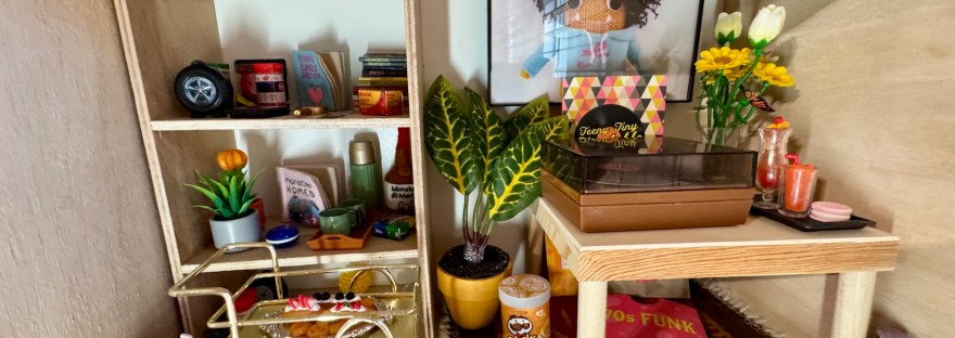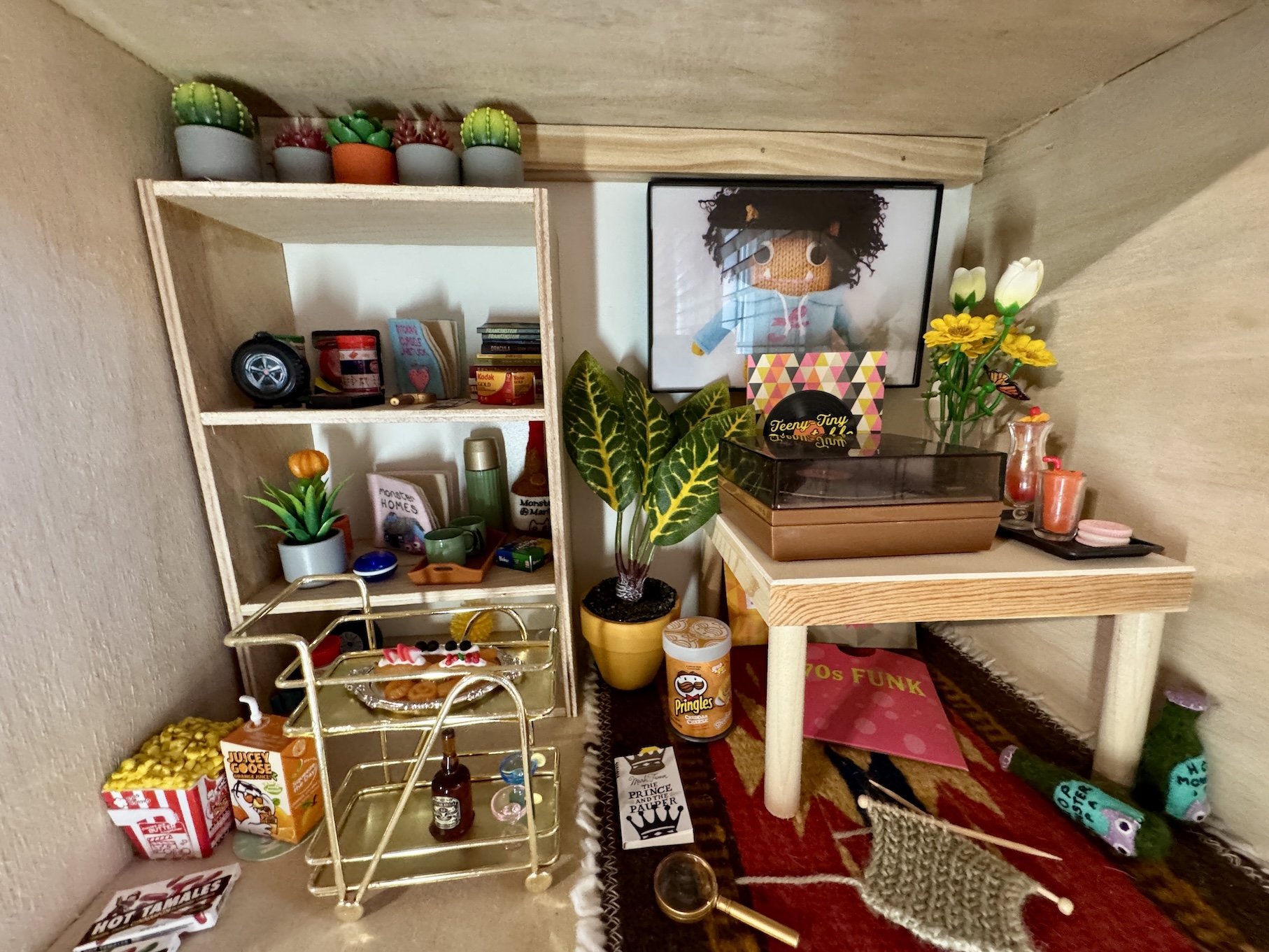 This is our main hang out area where we listen to records on our turntable (see my guest blogger post Guest Blogger: Teeny-Tiny Turntable Adventures), have Beastie-sized cocktails, snacks and I can work on my knitting.