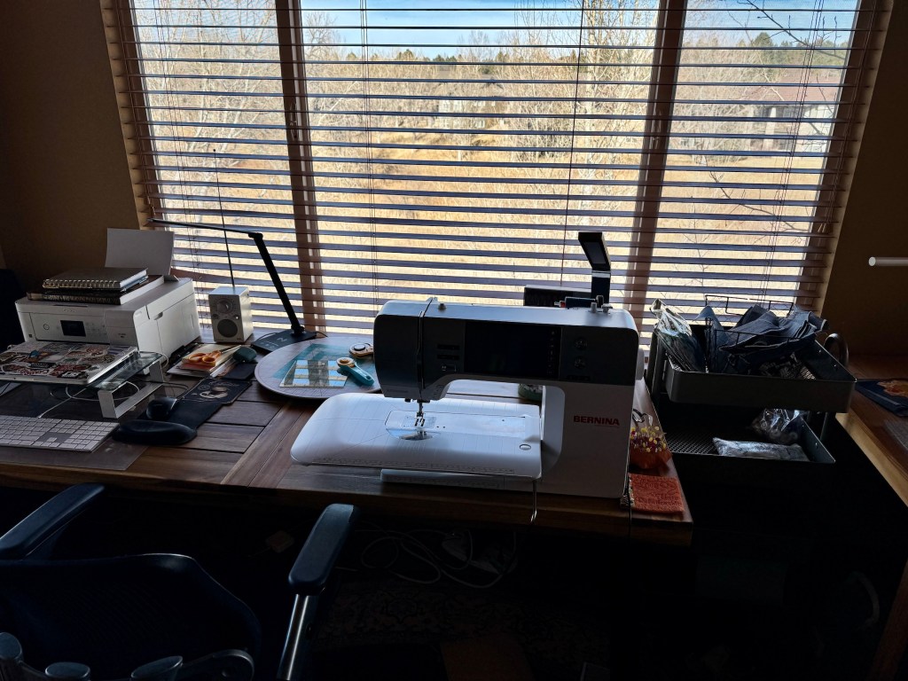 The house is currently in such chaos I needed a calm place in which I could blog and sew if I wanted until we get closer to our move date in early March. John came up with the idea of moving a table into our bedroom in front of the window and setting up my laptop and my sewing machine.