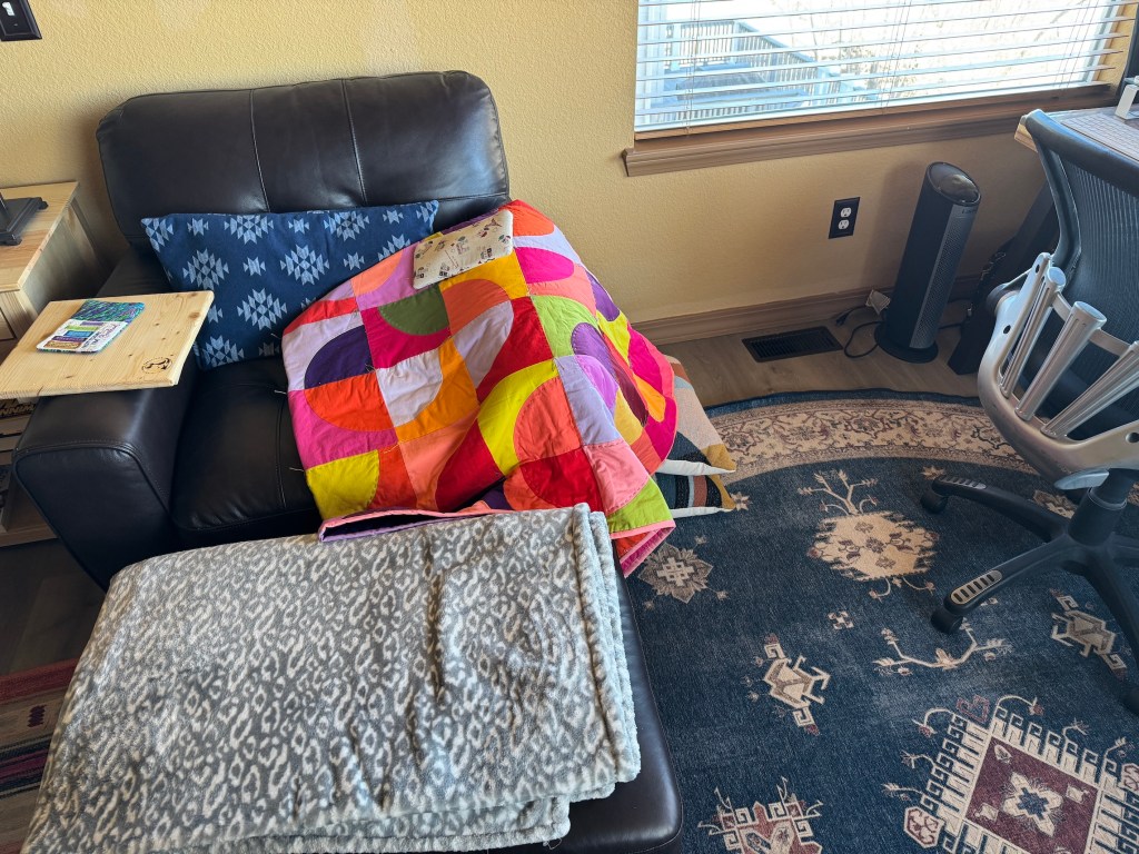 We also set up an area in our bedroom where I could sit and stitch on the quilt I am hand quilting (Hand Quilting “Go Boldly”) or read a book…or just enjoy an escape from boxes…