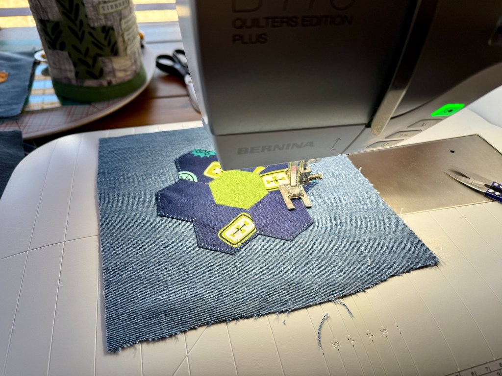 I made some great progress since then and I now have 37 EPP flowers machine appliquéd to scrap denim: