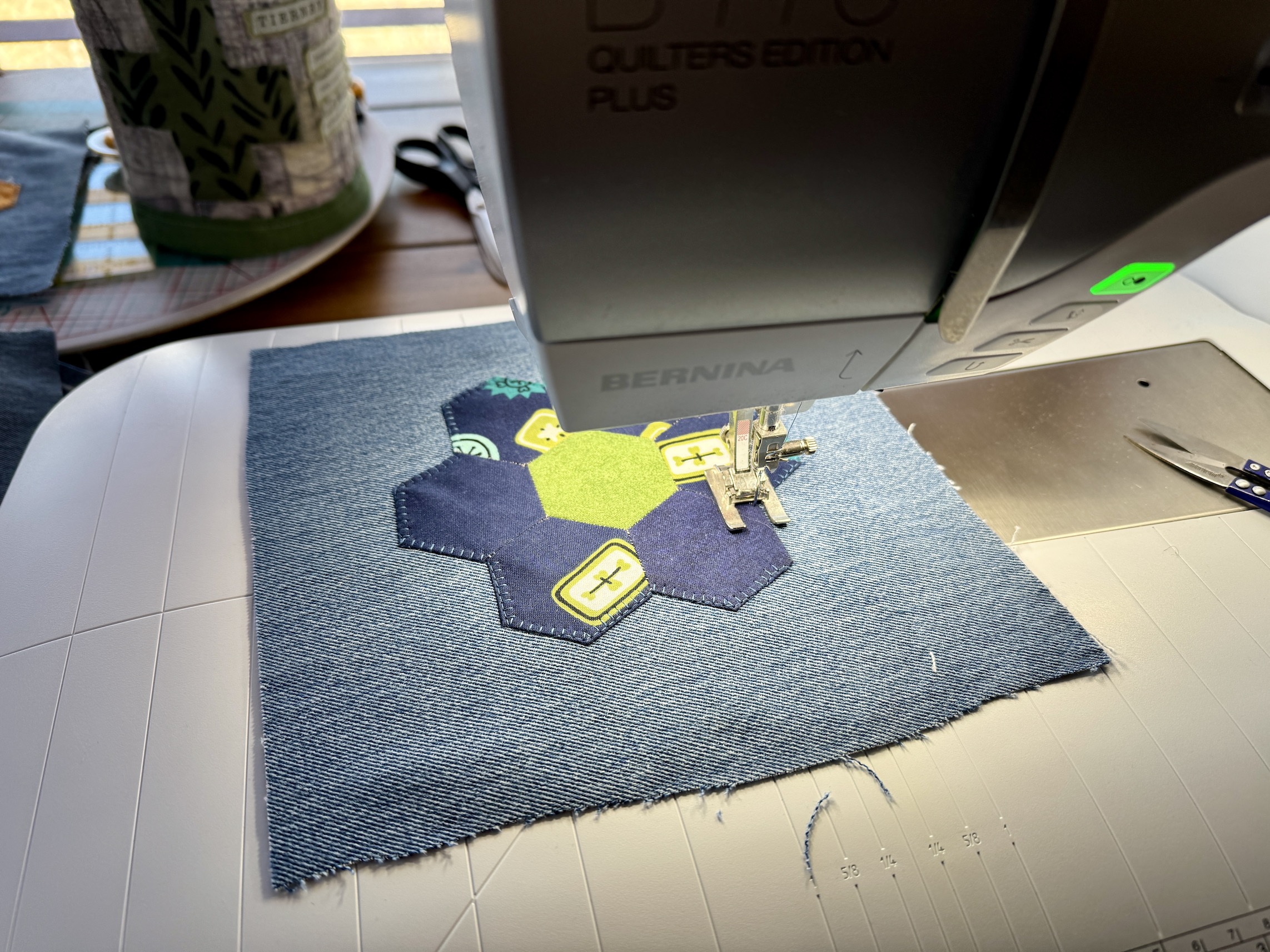 I made some great progress since then and I now have 37 EPP flowers machine appliquéd to scrap denim: