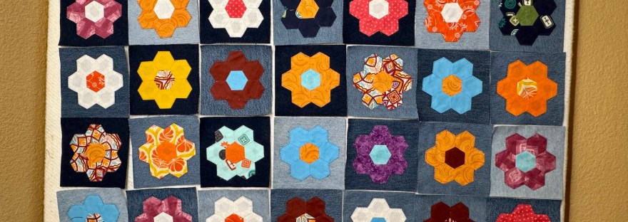 Life is currently crazy and filled with lots of boxes (see post How Did We Get Here? ) but I do have an update on the scrappy English Paper Piecing (EPP) hexie rosette project I’ve been working on since 2016 that I previously posted about in this post – ScrapHappy January 2026: Moving Forward on the Hexie Project .
