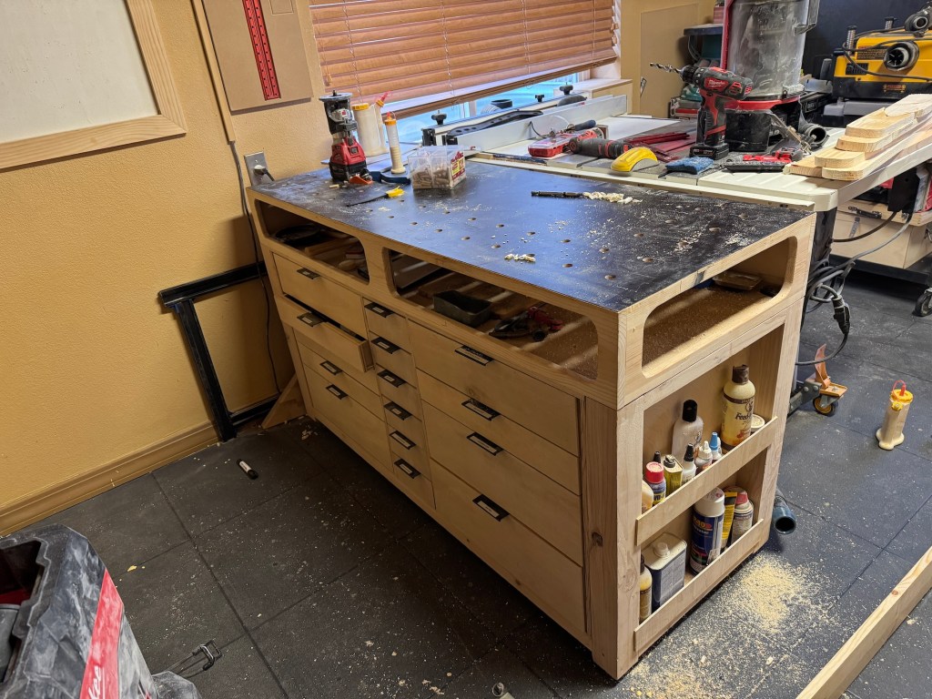 John was unhappy with the quality of the piece (he made it in his earlier days of woodworking) and he wanted to make me a table/storage unit like the Outfeed Table he made for his woodworking studio: