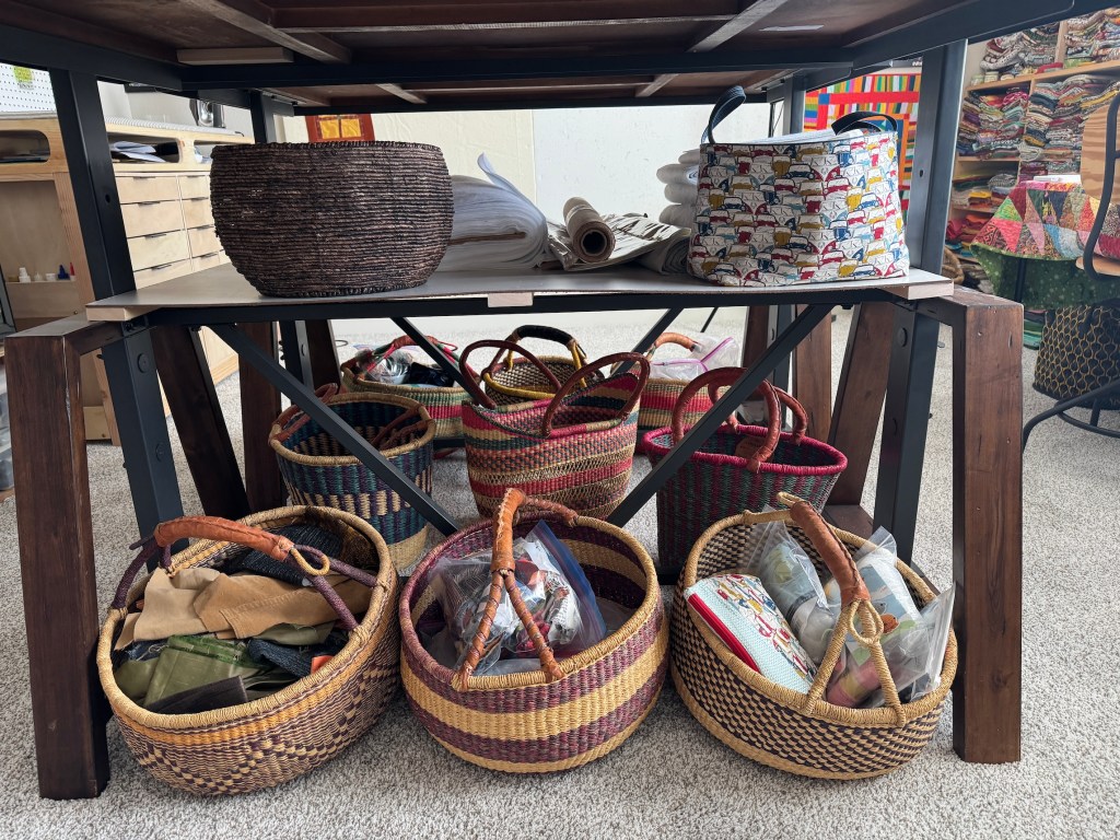 Projects stored in baskets under studio table: