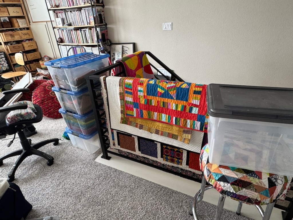 We also set up an area in our bedroom where I could sit and stitch on the quilt I am hand quilting (Hand Quilting “Go Boldly”) or read a book…or just enjoy an escape from boxes…