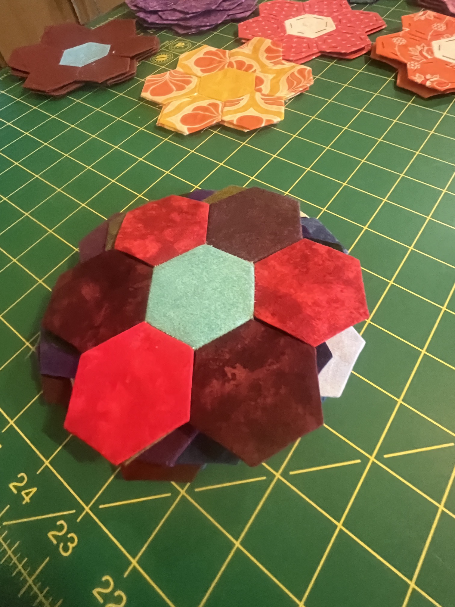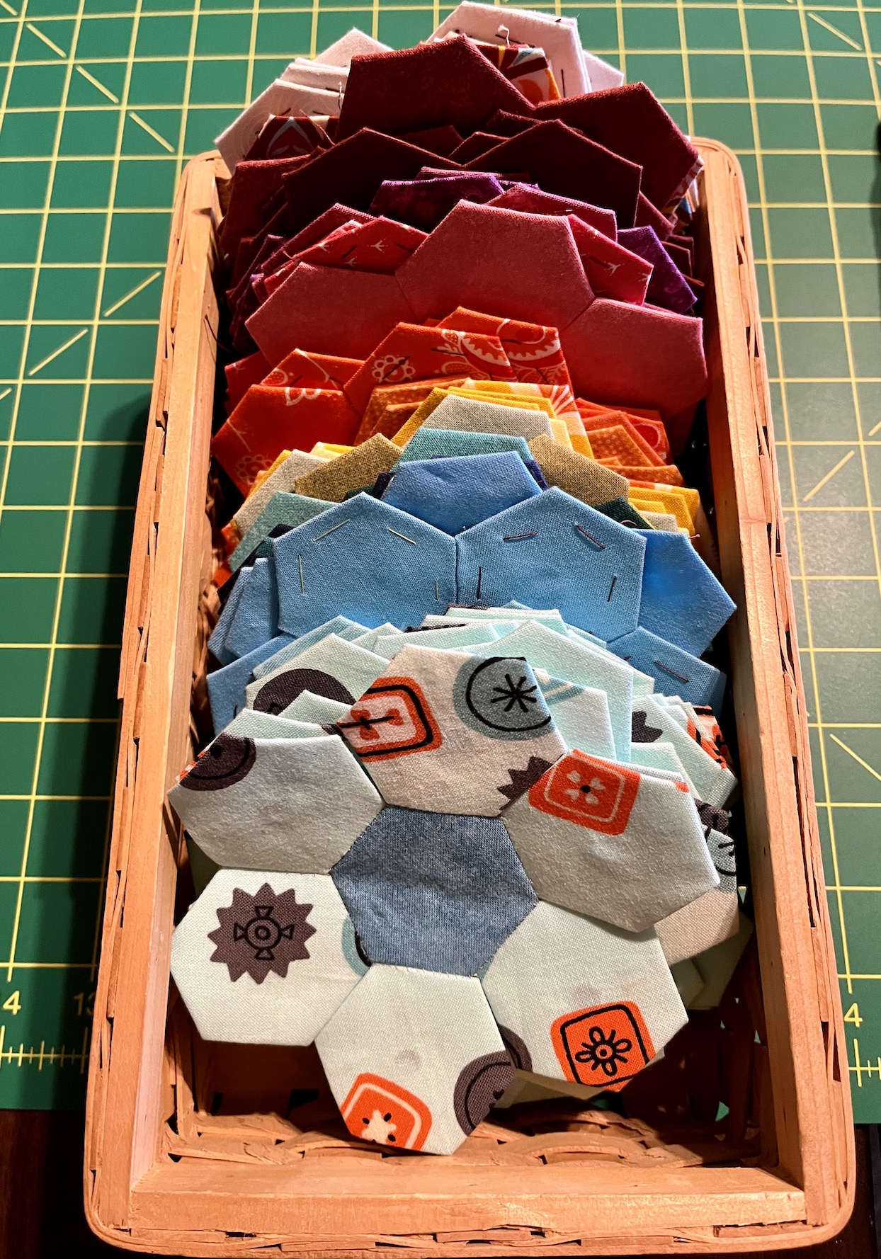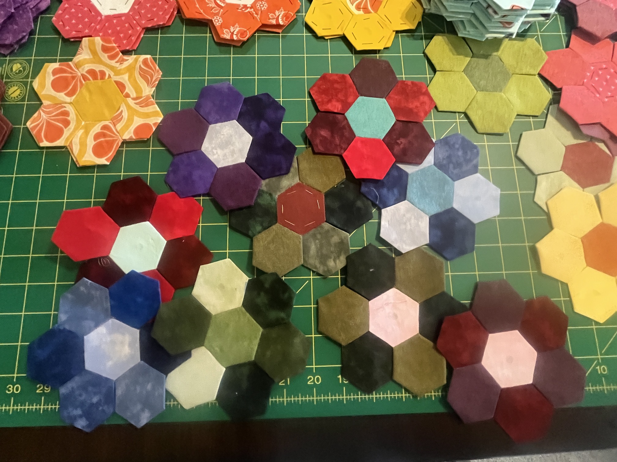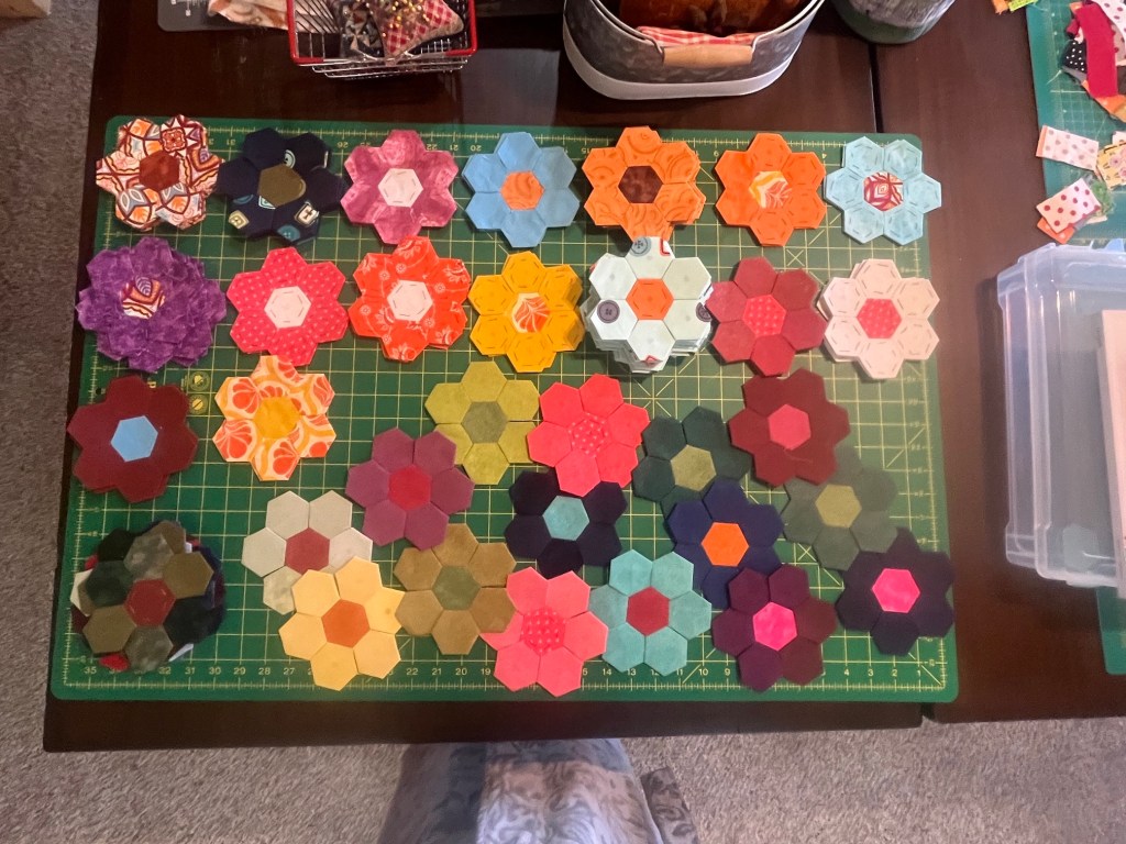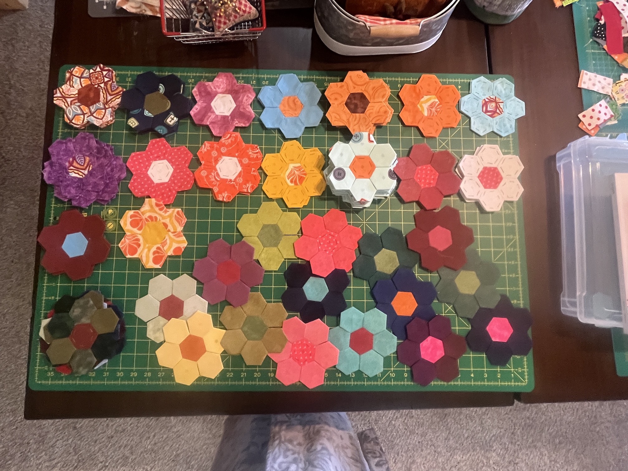 I finished paper piecing 99 hexie flowers (which each contained 7 paper pieced hexagons) in May 2024 from fabric scraps (that I sort of tried to coordinate).